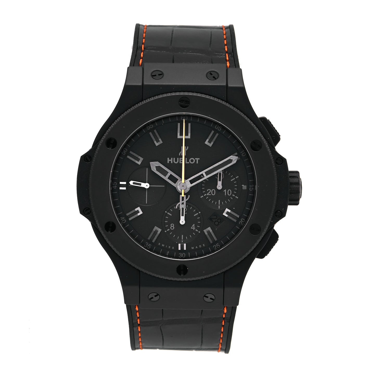 This is an authentic HUBLOT Ceramic Alligator 44mm Big Bang Limited Edition "Veuve Clicquot" Automatic Watch. The watch is crafted of black ceramic and matte black alligator strap with orange stitching, and features a black dial with orange accents, ceramic bezel, rubber crown and pushers, sapphire crystal, and an automatic chronograph movement.Follow this item for alerts. Hublot is a registered trademark of Hublot. FASHIONPHILE is not affiliated with Hublot.