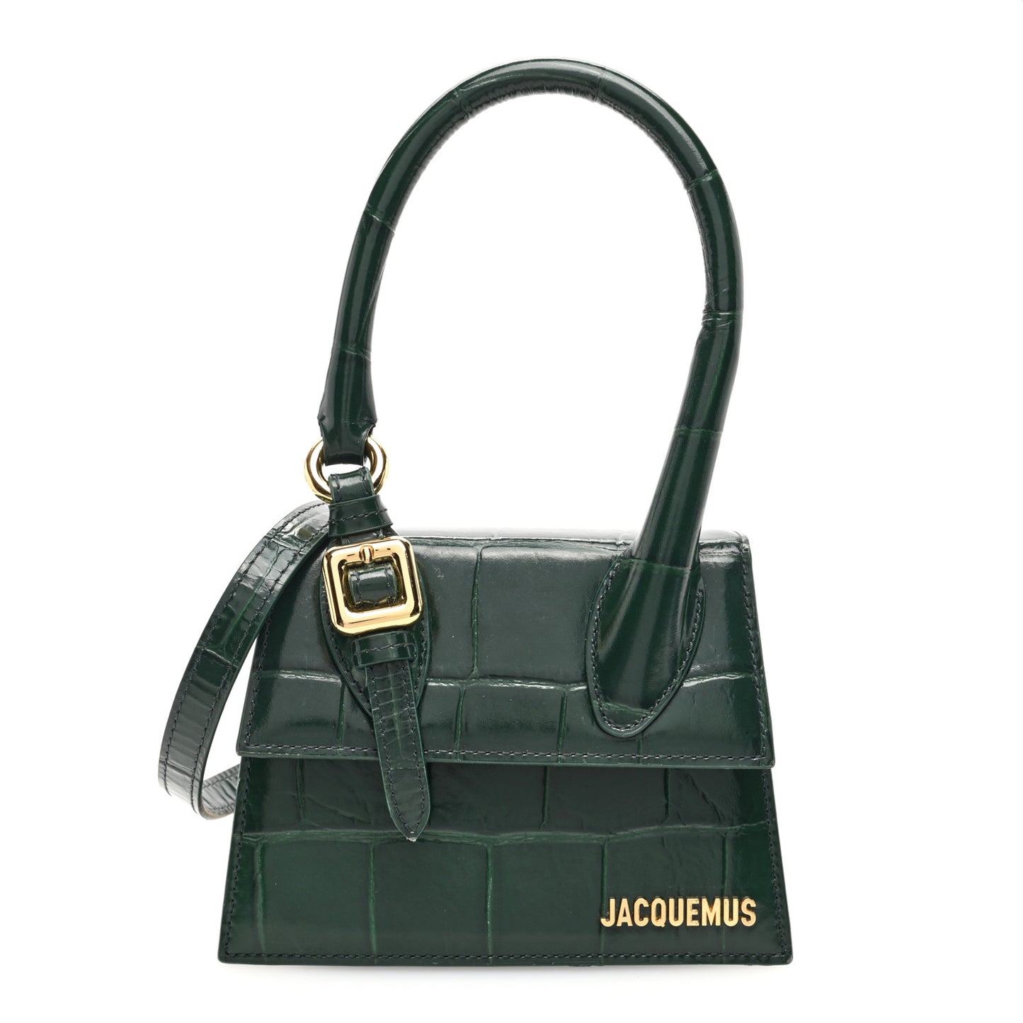 This is an authentic JACQUEMUS Calfskin Crocodile Embossed Le Chiquito Moyen in Dark Green. This stylish and structured handbag is crafted of crocodile embossed calfskin leather. The bag features a sturdy leather top handle with aged gold links, adjustable shoulder strap. The front flap opens with a magnetic snap closure to a beige interior with a flap pocket.