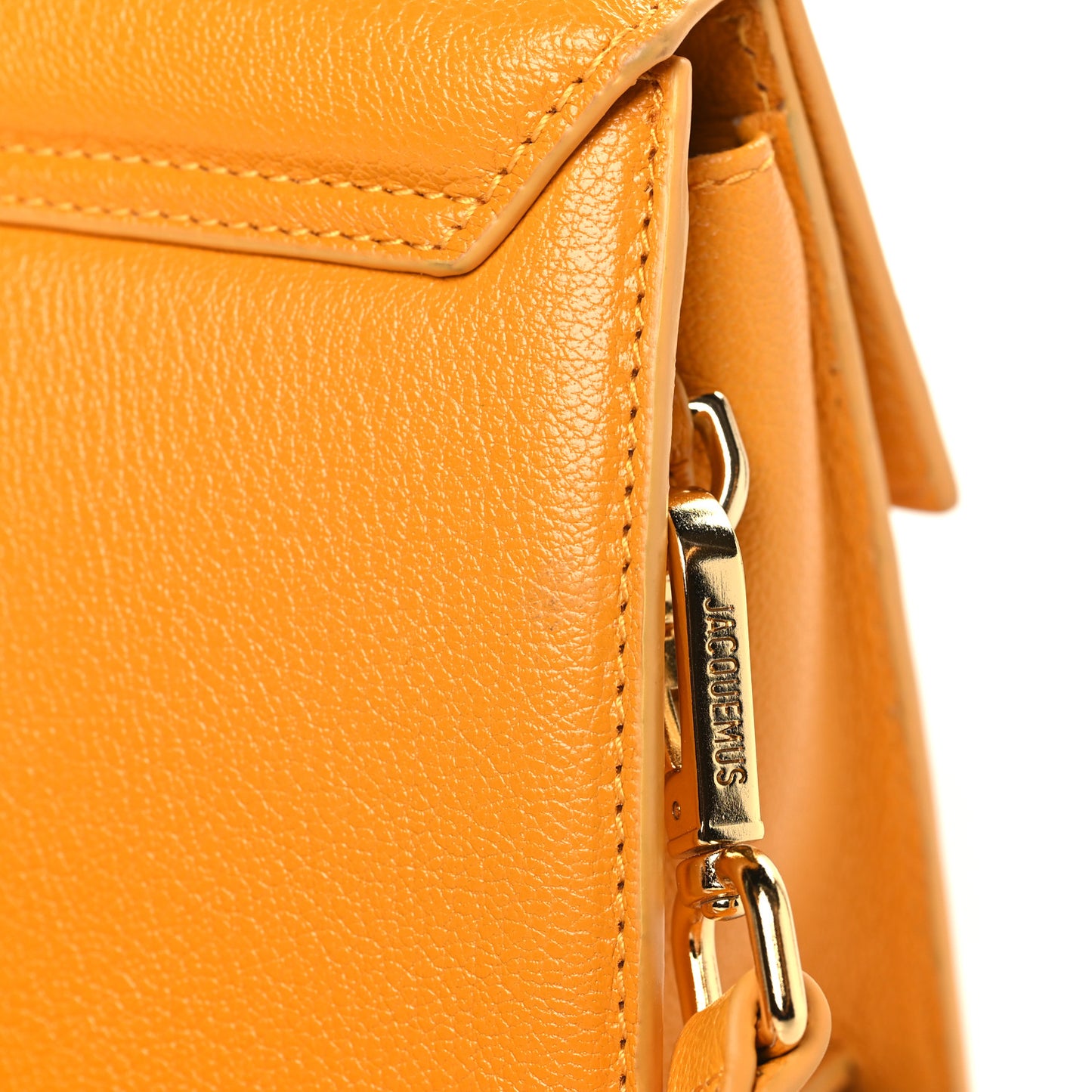This is the authentic JACQUEMUS Smooth Calfskin Le Chiquito Noeud in Orange. This chic bag is crafted of smooth calfskin leather in orange. The bag features a top handle, an optional leather shoulder strap, and gold hardware. The front flap opens to a beige fabric interior with a pocket.