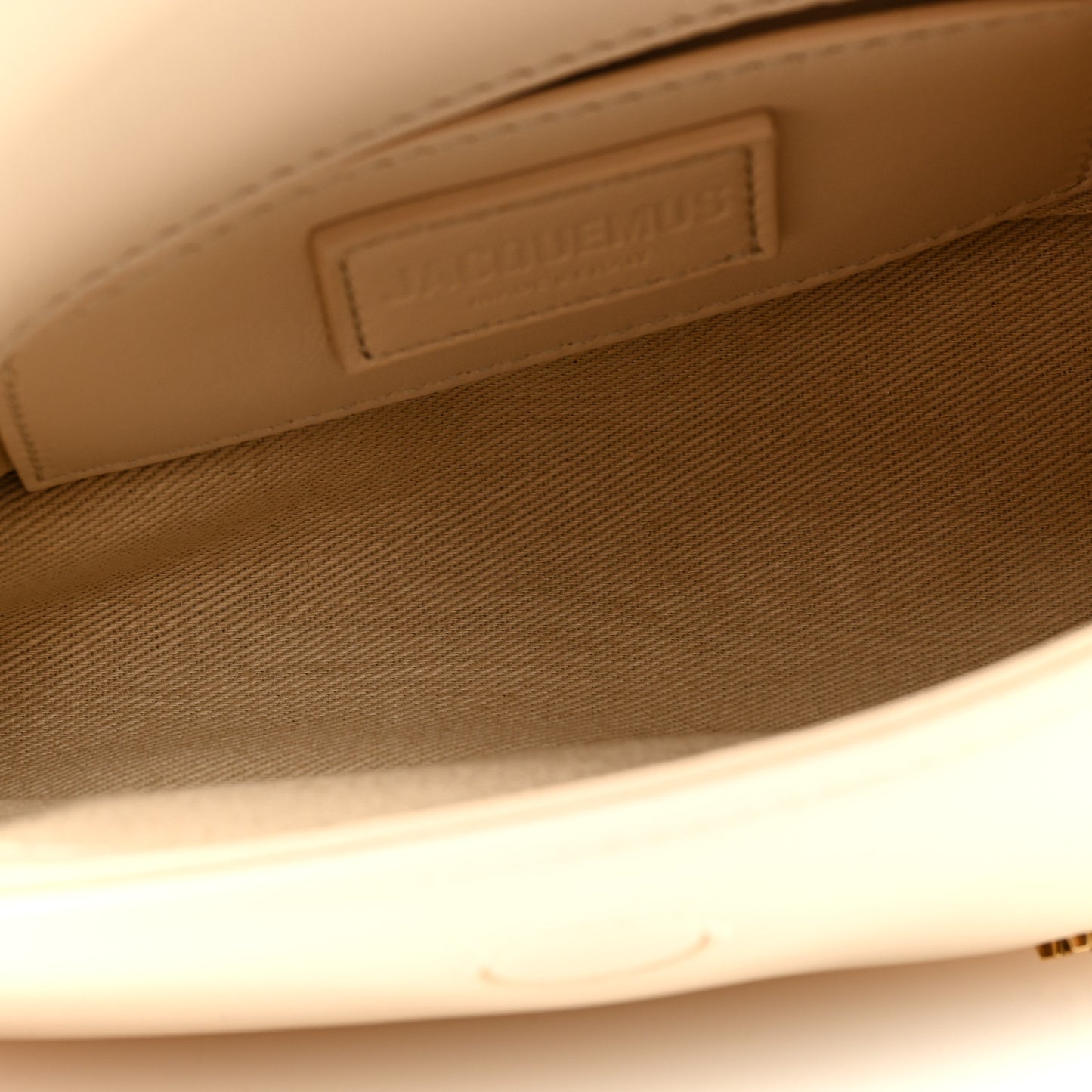 This is an authentic JACQUEMUS Padded Lambskin Le Petit Bambimou in Light Beige. This stylish petite handbag is beautifully crafted of soft padded lambskin leather in beige. It features two leather shoulder straps, the signature gold metal logo and hardware, and a slip pocket at the back. The front flap opens to a beige fabric interior with a patch pocket.Follow this item for alerts. Jacquemus is a registered trademark of Jacquemus. FASHIONPHILE is not affiliated with Jacquemus.