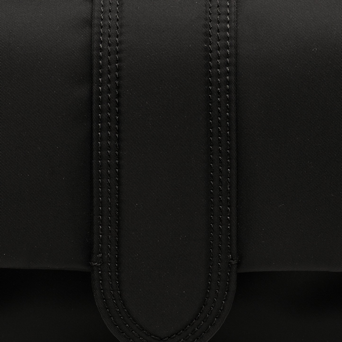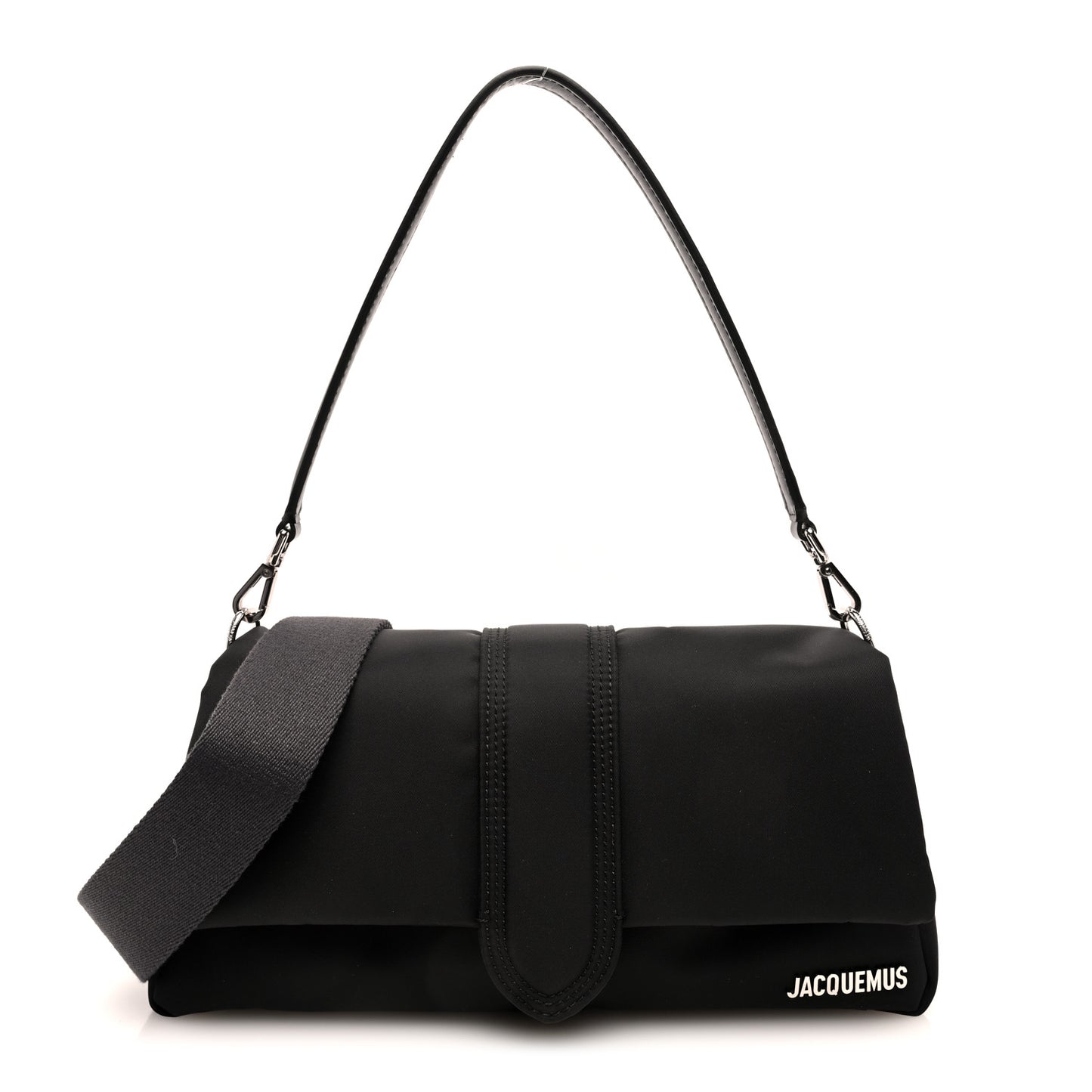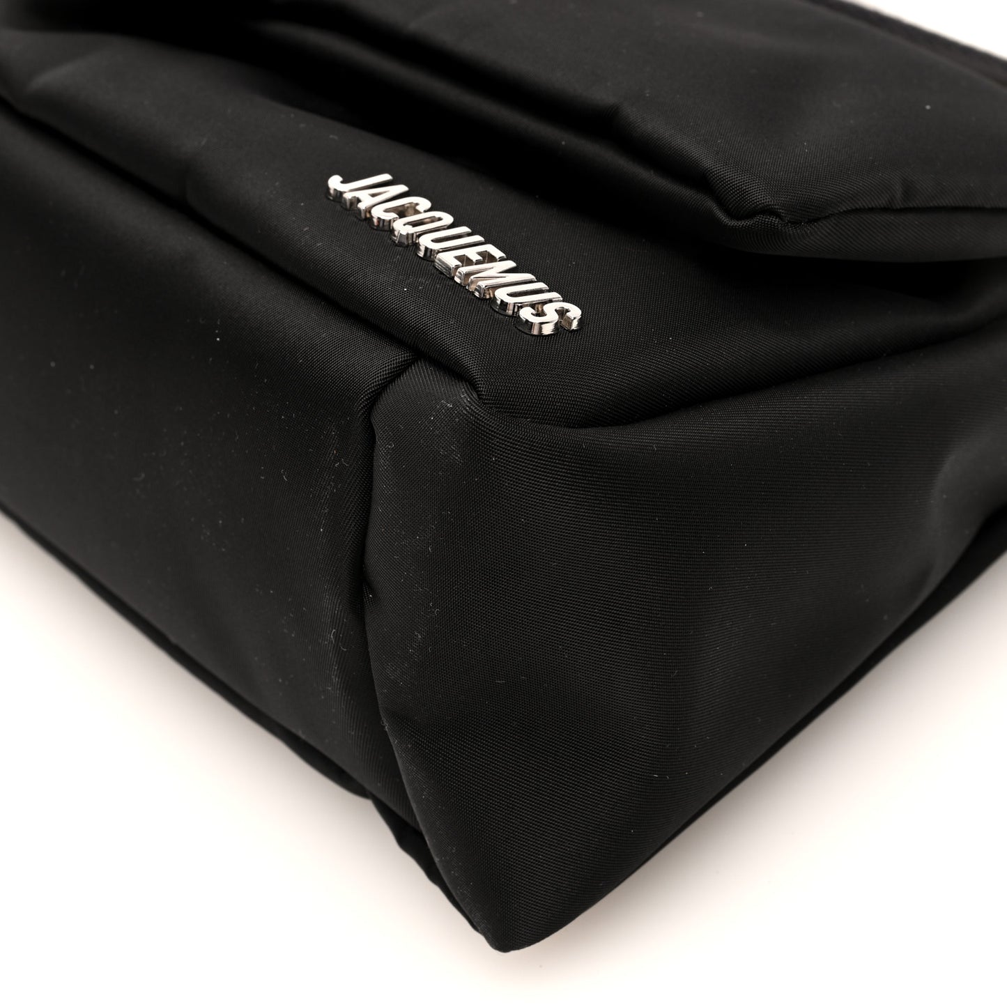 This is an authentic JACQUEMUS Padded Nylon Le Bambimou in Black. This stylish handbag is beautifully crafted of padded nylon in black. It features two leather shoulder straps, the signature silver metal logo and hardware, and a slip pocket at the back. The front flap opens to a beige fabric interior with a patch pocket.Follow this item for alerts. Jacquemus is a registered trademark of Jacquemus. FASHIONPHILE is not affiliated with Jacquemus.