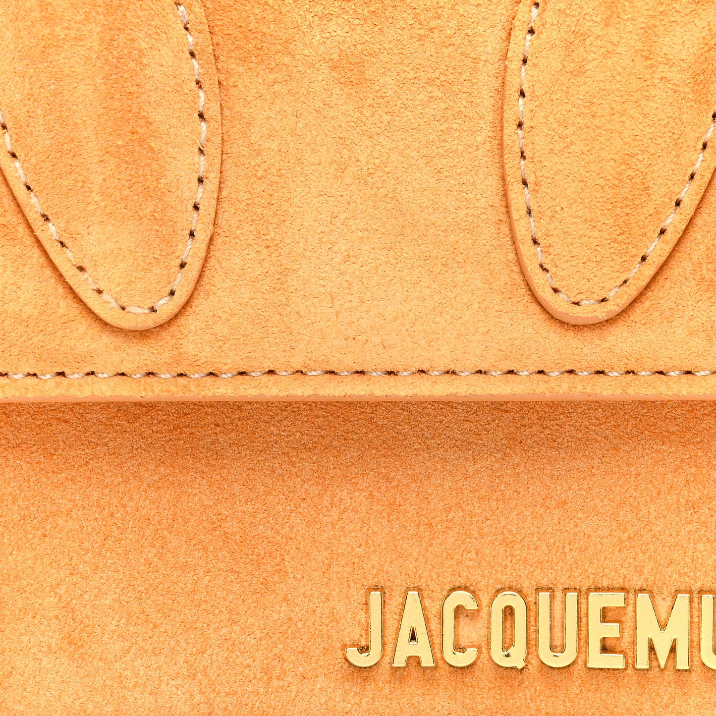 This is the authentic JACQUEMUS Suede Le Chiquito in Light Orange. This chic mini bag is crafted of suede leather in light green. The bag features a large top handle, an optional leather shoulder strap, and gold hardware. The front flap opens to a fabric interior with a pocket.Follow this item for alerts. Jacquemus is a registered trademark of Jacquemus. FASHIONPHILE is not affiliated with Jacquemus.