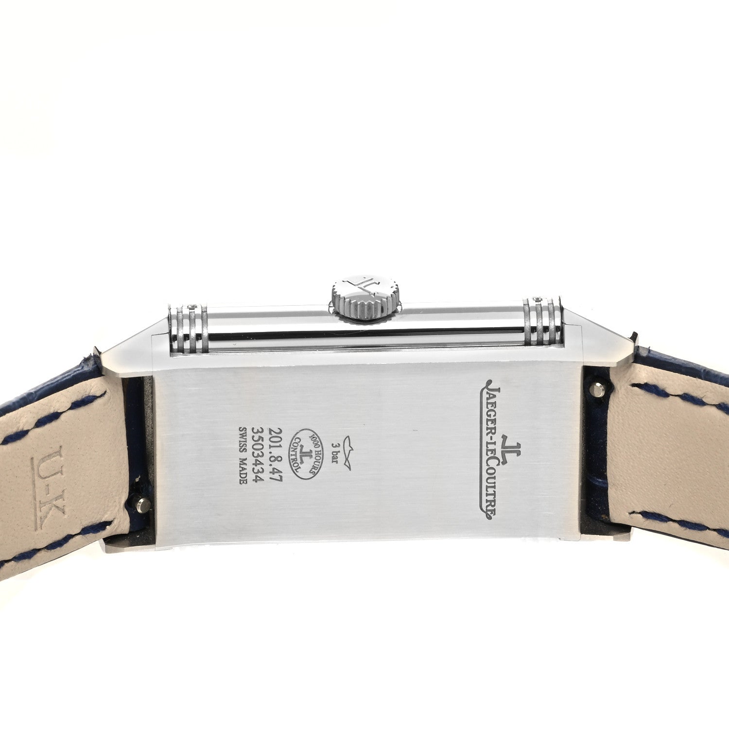 This is an authentic JAEGER-LECOULTRE Stainless Steel Alligator Diamond 20mm Reverso One MonoFace Quartz Watch Q3288420. The watch is crafted of stainless steel and features an ivory dial, diamond accented bezel, blue alligator strap, sapphire crystal, and a quartz movement.Follow this item for alerts. Jaeger-LeCoultre is a registered trademark of Jaeger-LeCoultre. FASHIONPHILE is not affiliated with Jaeger-LeCoultre.