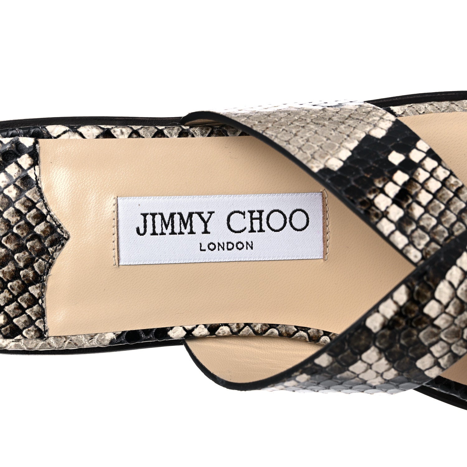 These are authentic JIMMY CHOO Calfskin Snake Print Atia Flat Sandals size 37.5 in Natural. The unique style and sophisticated sandals are crafted in leather with a snake print detail. These sandals feature a gold Jimmy Choo detail on the back and rubber heels on the bottom.Follow this item for alerts. Jimmy Choo is a registered trademark of Jimmy Choo. FASHIONPHILE is not affiliated with Jimmy Choo.