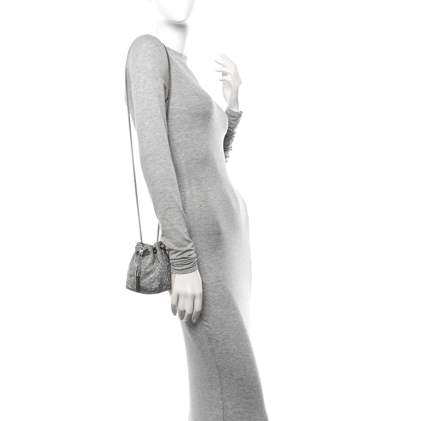This is an authentic JIMMY CHOO Satin Crystal Embellished Micro Bon Bon Bag in Silver. This chic bag is crafted with a crystal embellishment. The bag features a drawstring chain opening, metal ring top handle, and a silver chain shoulder strap. The top opens to a silver satin interior.