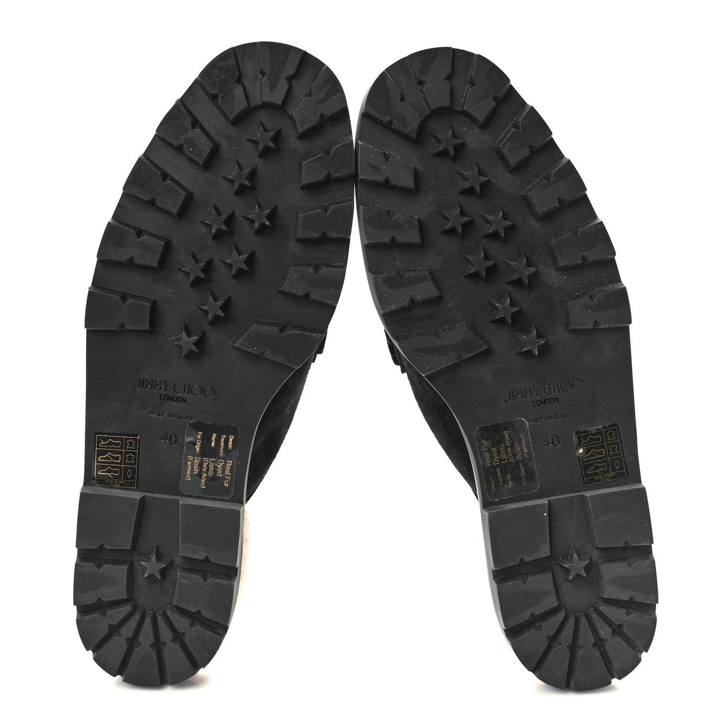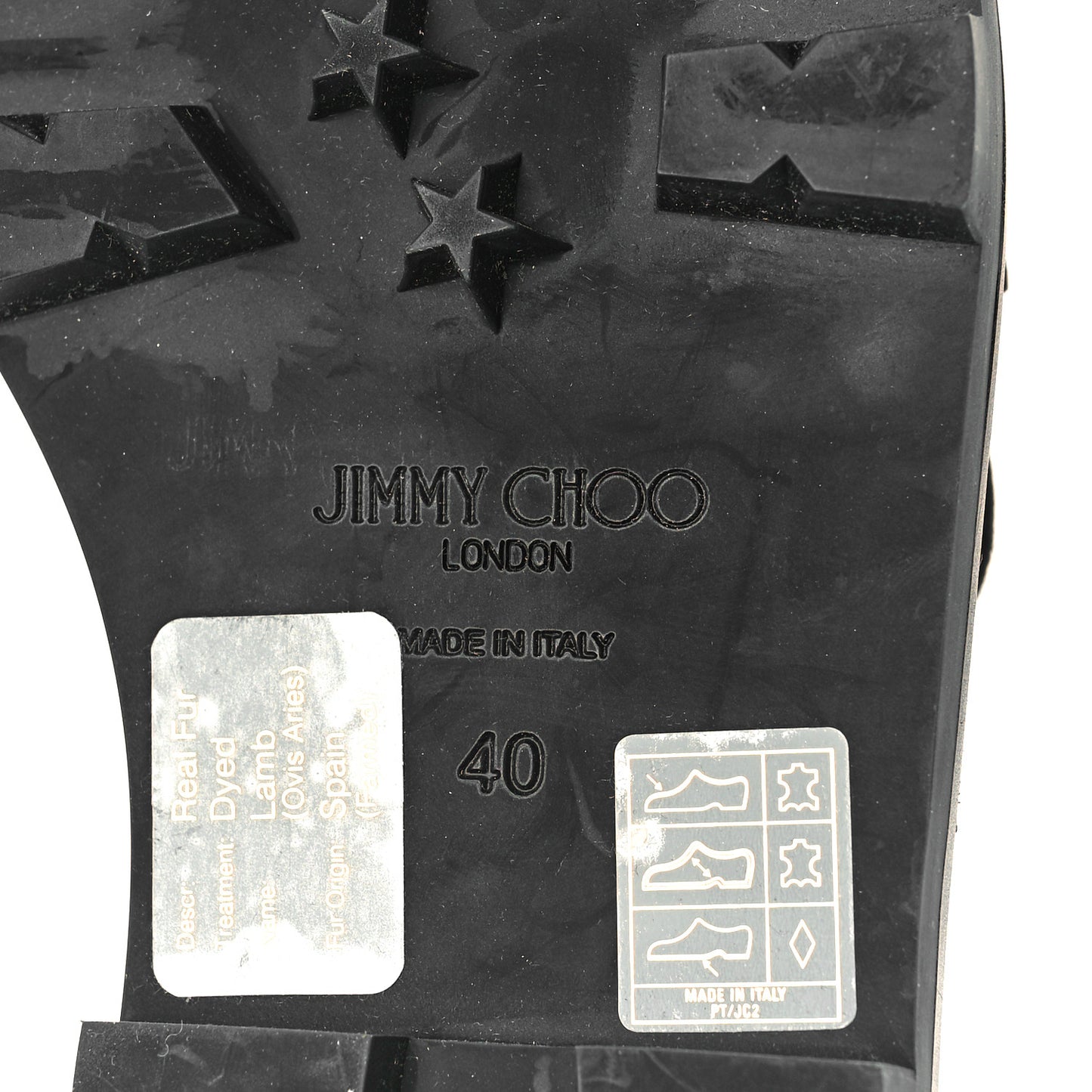 This is an authentic pair of JIMMY CHOO Suede Shearling Ronnie Flat Mules 40 in Black and Natural. These ultra chic espadrilles are crafted of suede leather and are embellished with silver stud detail.Follow this item for alerts. Jimmy Choo is a registered trademark of Jimmy Choo. FASHIONPHILE is not affiliated with Jimmy Choo.