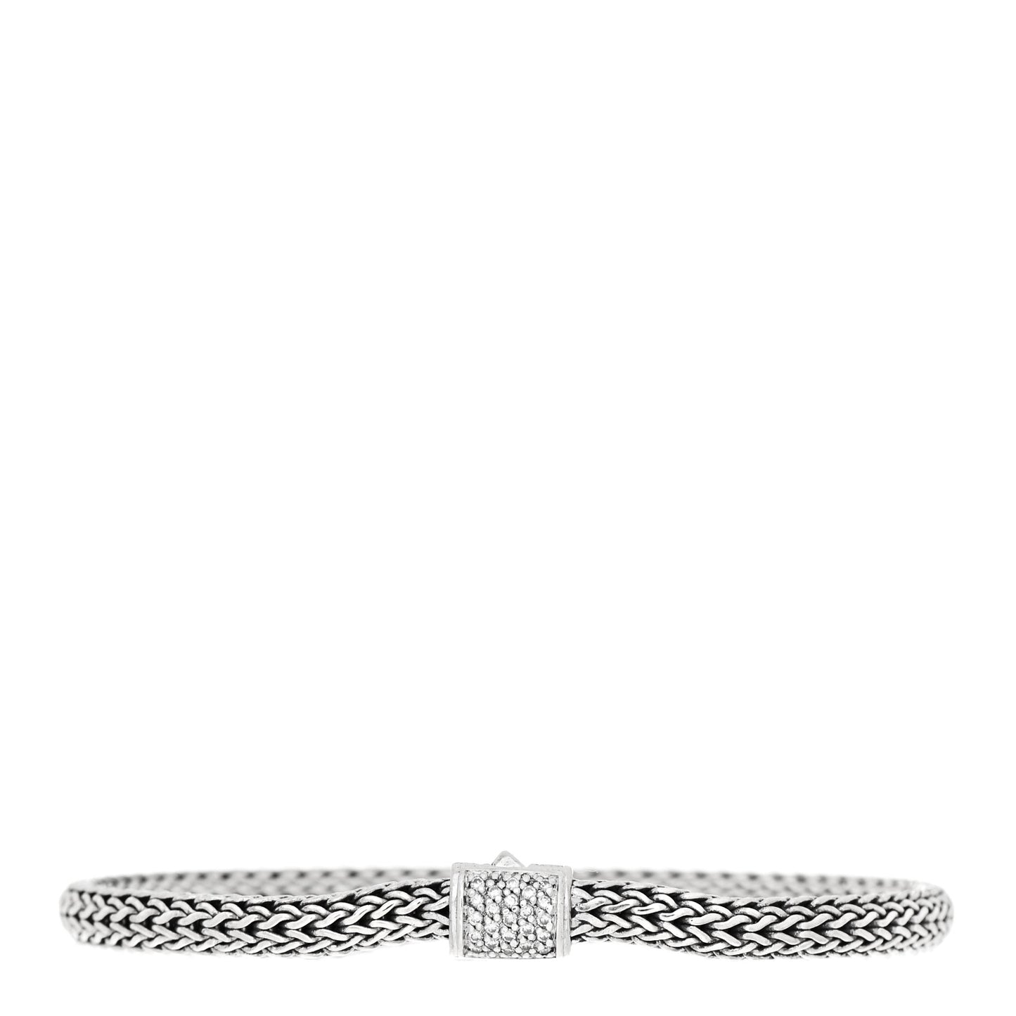 This is an authentic JOHN HARDY Sterling Silver Diamond 5mm Classic Chain Bracelet. The bracelet is crafted of sterling silver and features the classic hand-woven chain with a slide clasp set with diamonds, approximately .18 total carat weight.Follow this item for alerts. John Hardy is a registered trademark of John Hardy. FASHIONPHILE is not affiliated with John Hardy.