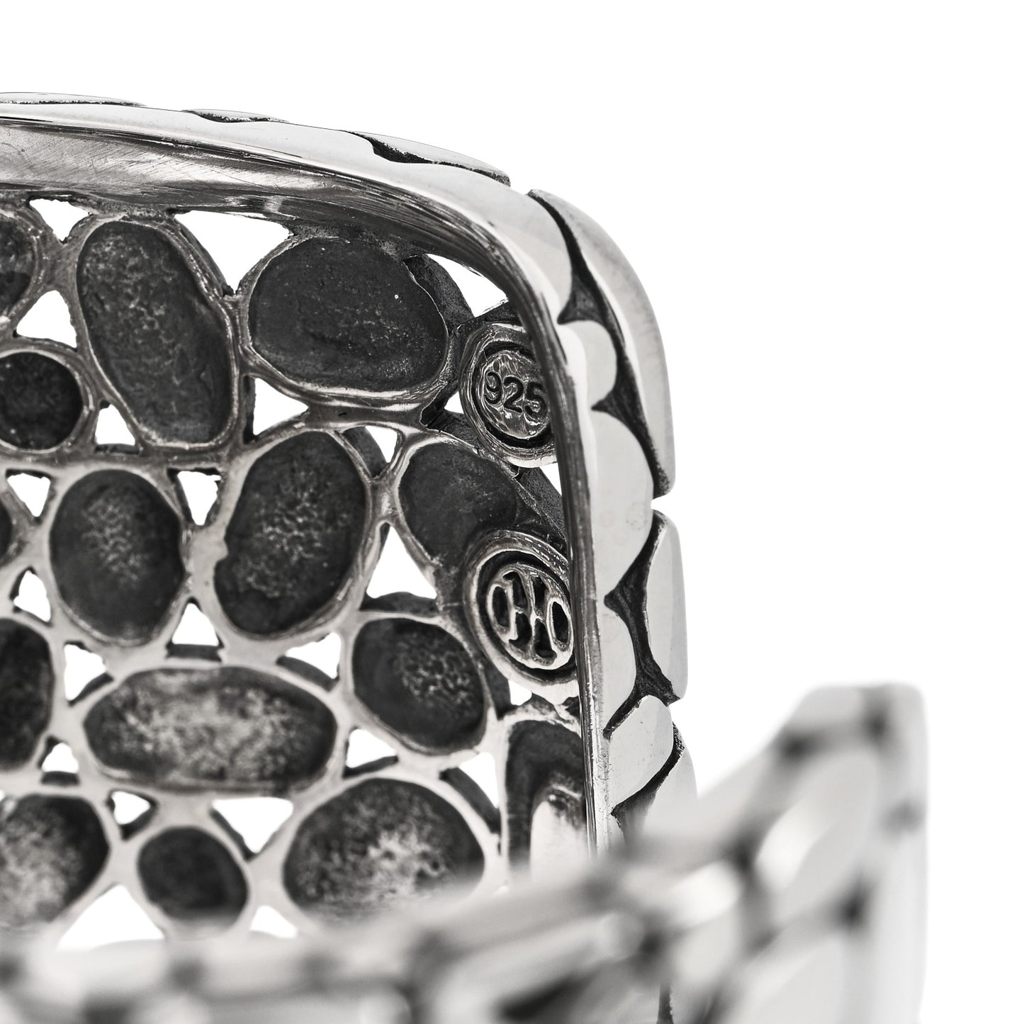 This is an authentic JOHN HARDY Sterling Silver Kali Overlap Cuff Bracelet. The bracelet is crafted of sterling silver and features a wide open cuff with an overlap motif at the top, accented with the signature "Kali" pebble design.Follow this item for alerts. John Hardy is a registered trademark of John Hardy. FASHIONPHILE is not affiliated with John Hardy.