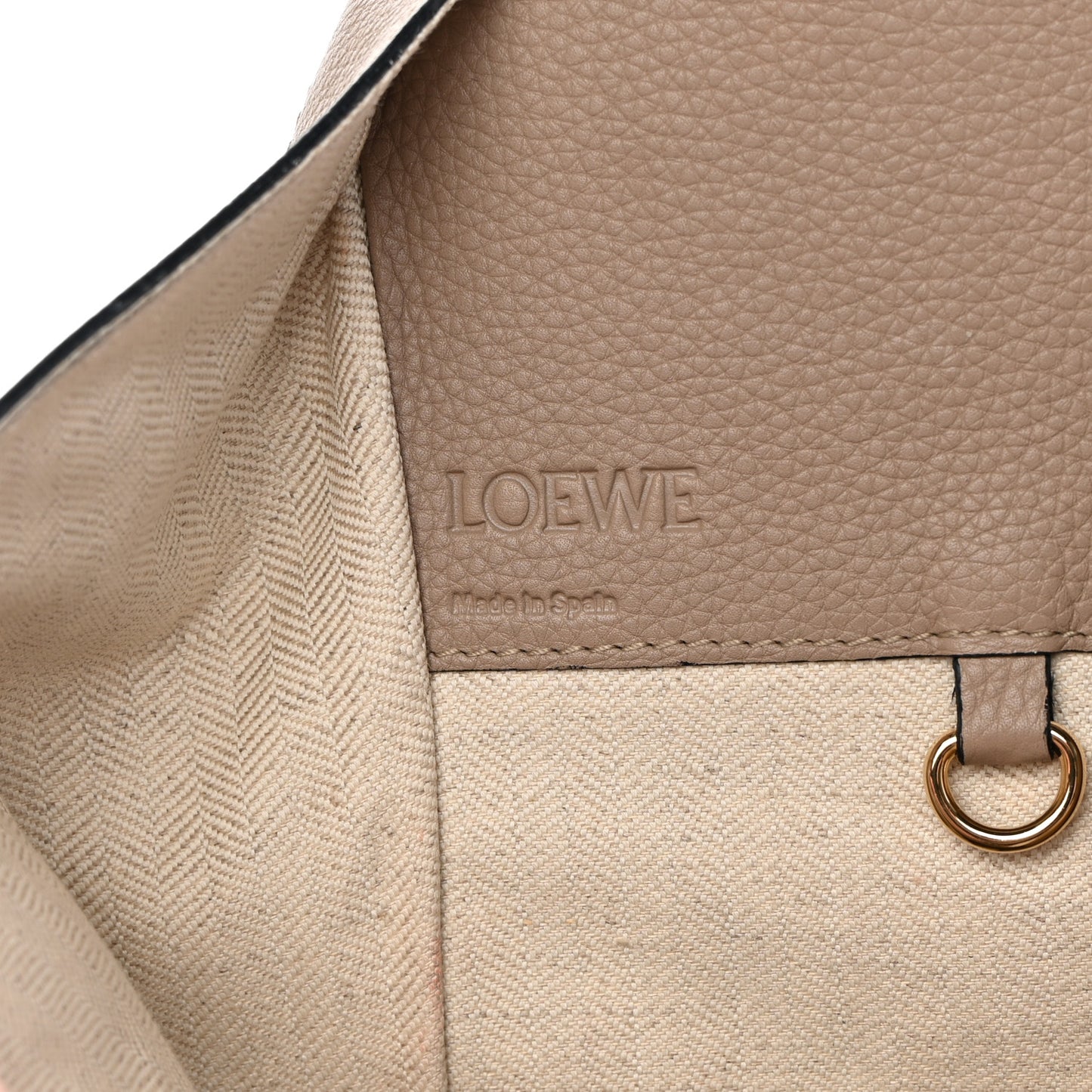 This is an authentic LOEWE Calfskin Medium Hammock Shoulder Bag in Sand and Mink. This chic and lovely tote is crafted of luxuriously soft calfskin leather in beige with brown leather trim. This handbag features a unique one piece reinforced design with leather handles and an optional adjustable shoulder strap. The top opens to a spacious beige fabric interior with small patch pockets.Follow this item for alerts. Loewe is a registered trademark of Loewe. FASHIONPHILE is not affiliated with Loewe.