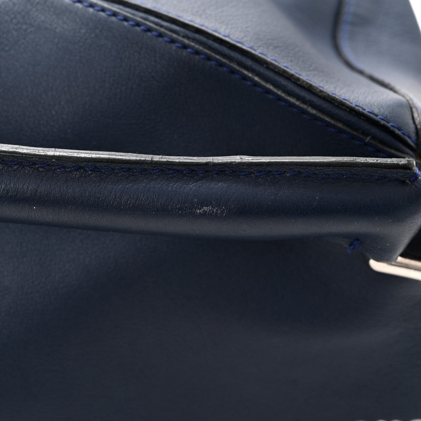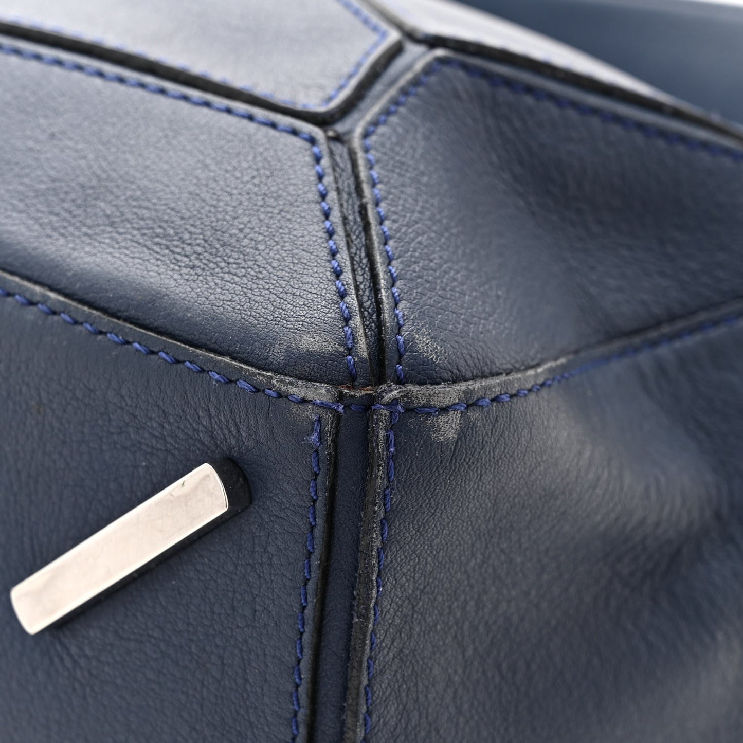 This is an authentic LOEWE Calfskin Medium Puzzle Bag in Marine. This handbag is crafted of blue calfskin leather. The bag features a rear zipper pocket, an optional shoulder strap, and gold hardware. The top zipper opens to a beige fabric interior with patch pockets.