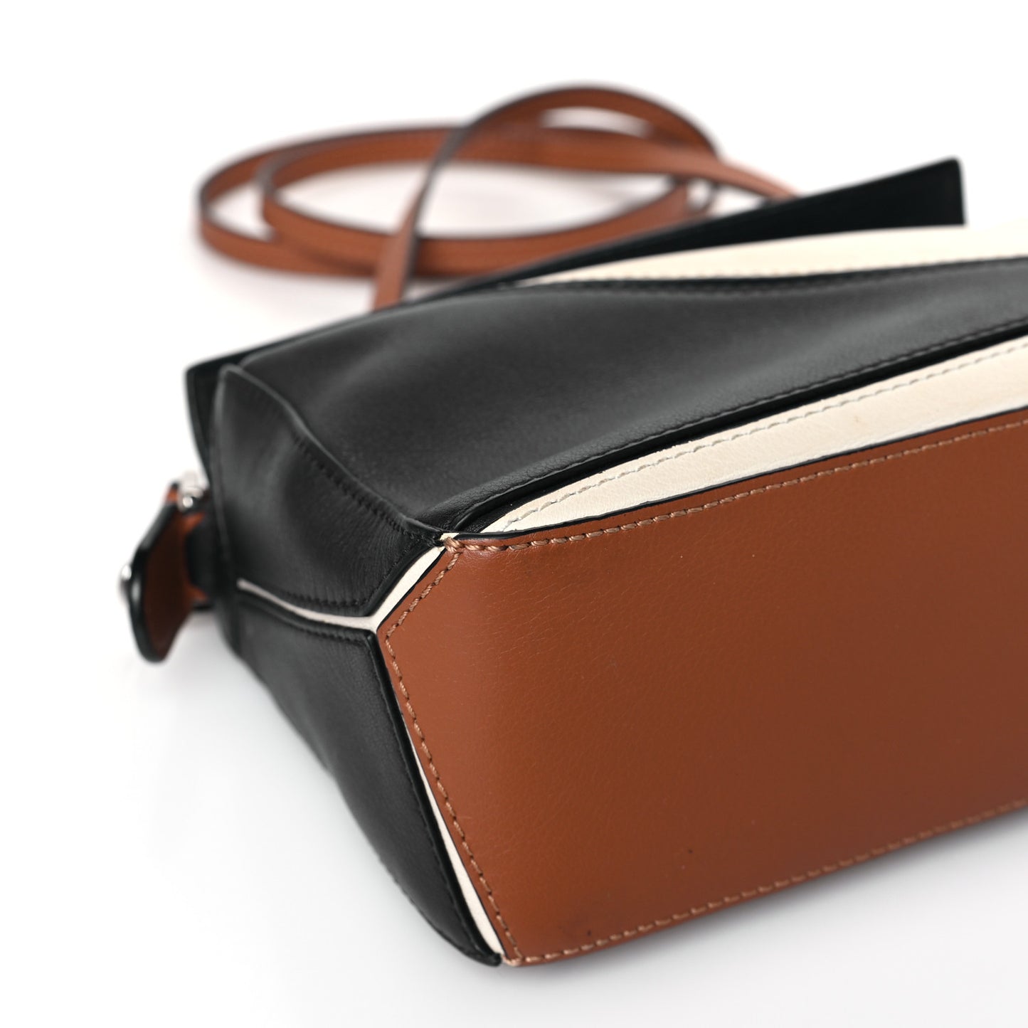 This is an authentic LOEWE Calfskin Mini Puzzle Bag in Deep Blue and Soft White. This stunning bag is crafted of smooth calfskin leather in blue, brown, and white. The bag features a rolled leather handle and an optional leather shoulder strap with polished silver hardware. The top zipper opens to a beige fabric interior.Follow this item for alerts. Loewe is a registered trademark of Loewe. FASHIONPHILE is not affiliated with Loewe.