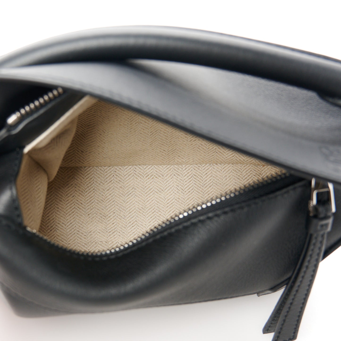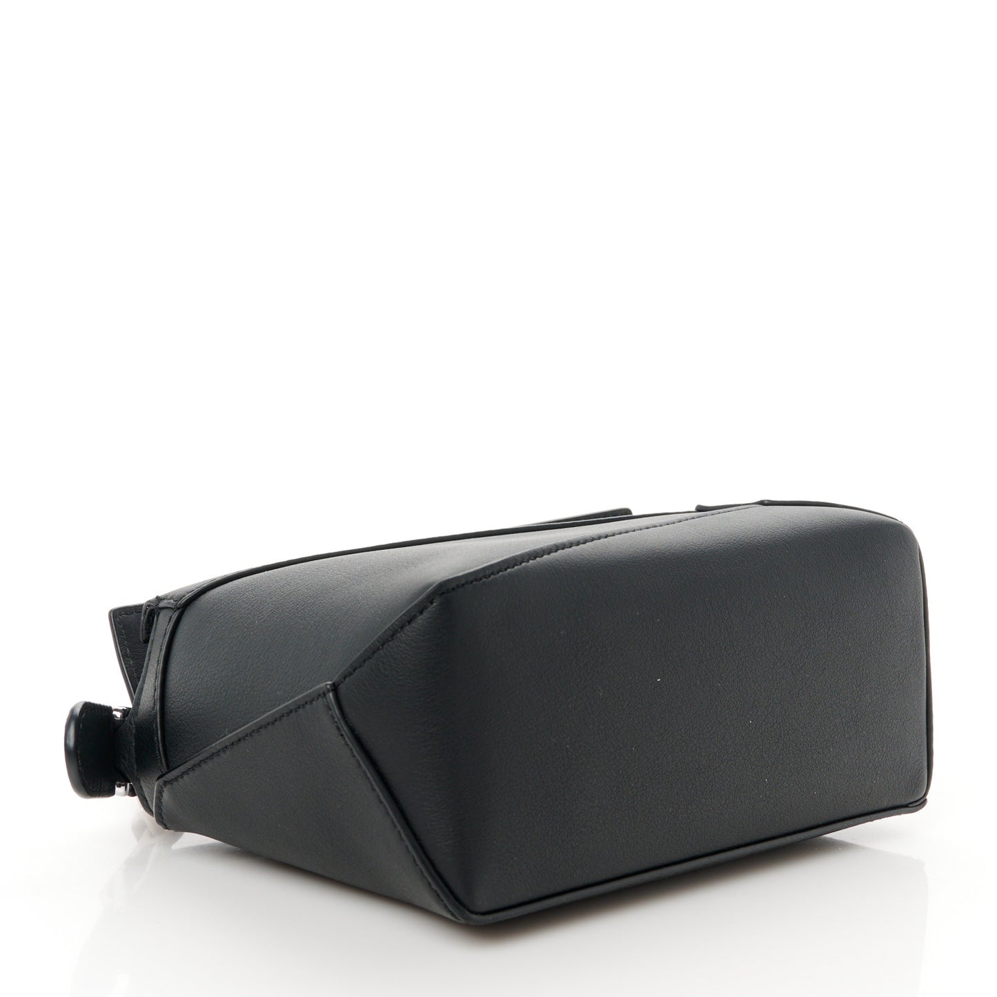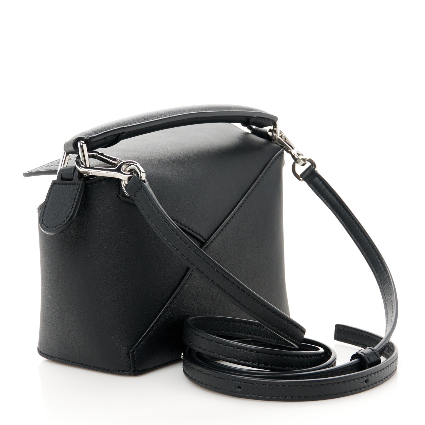 This is an authentic LOEWE Calfskin Mini Puzzle Edge Bag in Black. This mini bag is crafted of black calfskin leather. The bag features a black top handle, an optional adjustable shoulder strap, and silver hardware. This top zipper opens to a beige fabric interior.Follow this item for alerts. Loewe is a registered trademark of Loewe. FASHIONPHILE is not affiliated with Loewe.