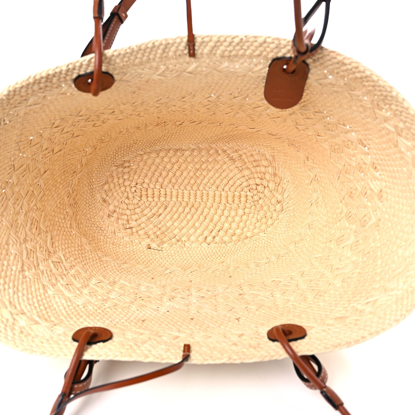 This is an authentic LLOEWE Iraca Palm Calfskin Anagram Basket Bag in Natural and Tan. This chic tote is crafted of natural woven irica palm raffia, with brown leather top handles and a hanging brown leather Loewe logo. The top is open to a spacious matching interior.Follow this item for alerts. Loewe is a registered trademark of Loewe. FASHIONPHILE is not affiliated with Loewe.