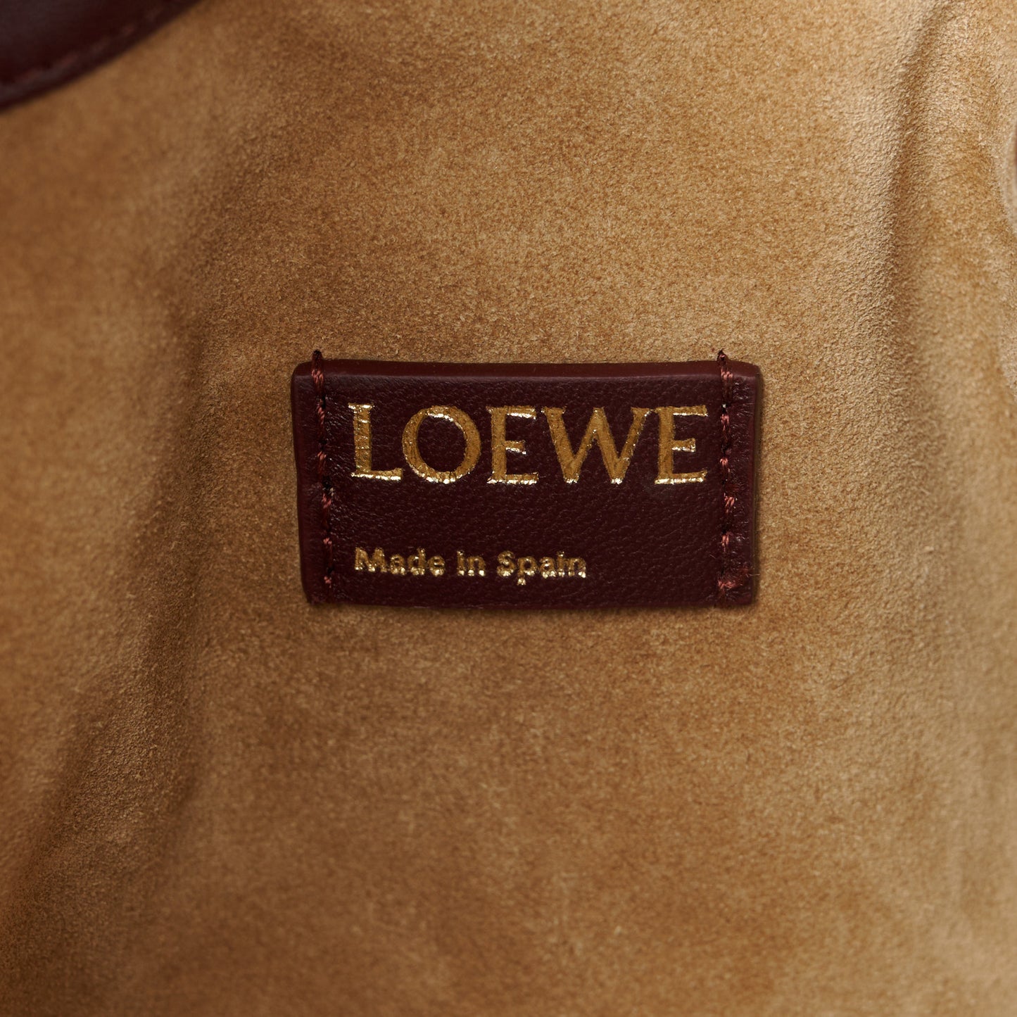 This is an authentic LOEWE Mellow Nappa Donut Chain Large Flamenco Knot Clutch in Dark Burgundy. This stunning bag is crafted of soft and supple nappa leather in burgundy. The bag features a removable donut chain strap, an adjustable leather strap, and a coiled knot drawstring. The top opens to a spacious brown suede interior.Follow this item for alerts. Loewe is a registered trademark of Loewe. FASHIONPHILE is not affiliated with Loewe.