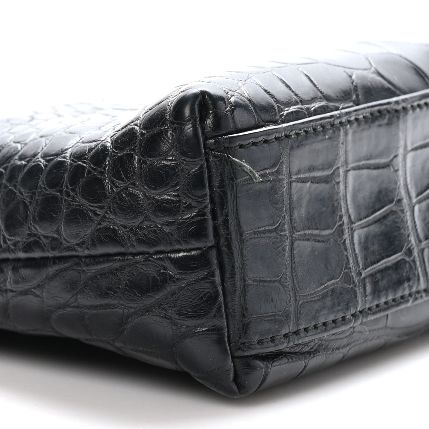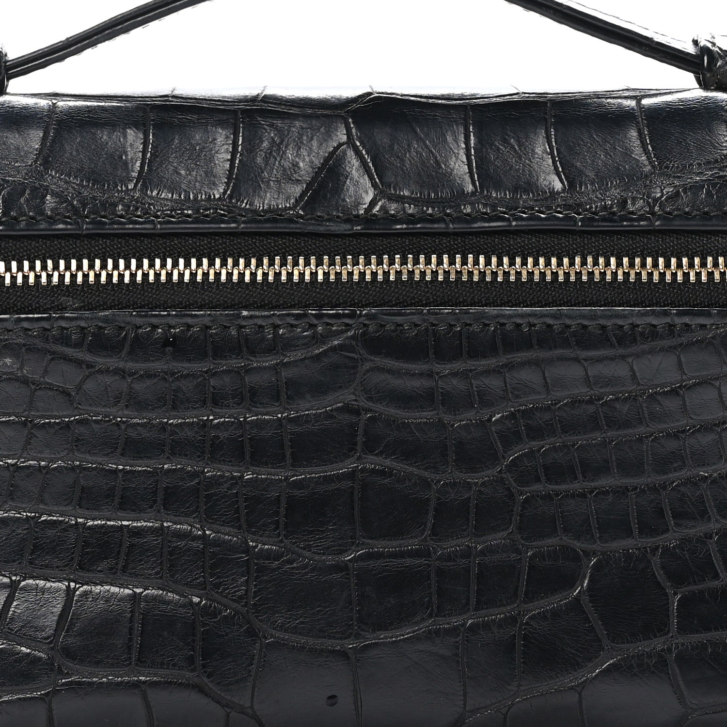 This is an authentic LORO PIANA Crocodile L19 Extra Pocket Pouch in Black. This chic handbag is crafted of crocodile leather in black. It features a top handle, gold-tone hardware, and opens to a matching lambskin interior.Follow this item for alerts. Loro Piana is a registered trademark of Loro Piana. FASHIONPHILE is not affiliated with Loro Piana.