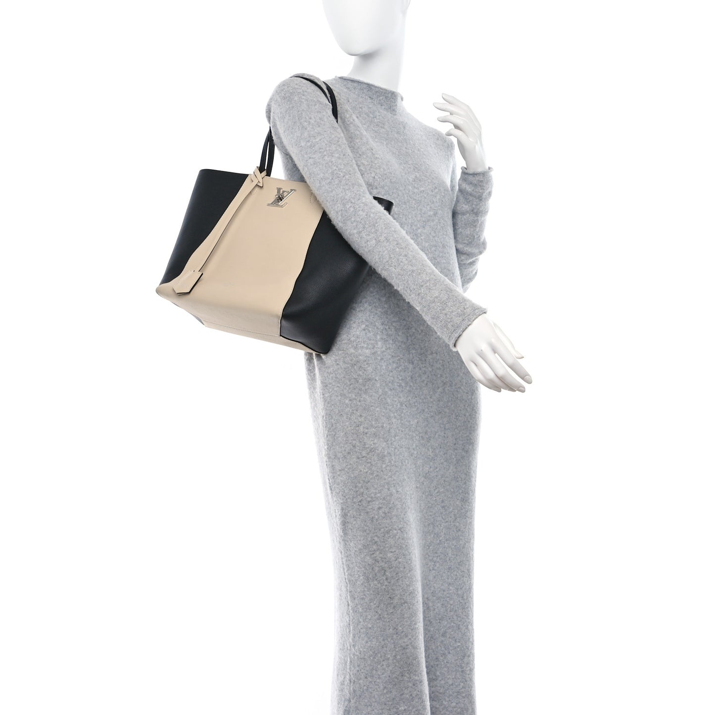 This is an authentic LOUIS VUITTON Calfskin Lockme Go Tote in Black and Vanilla. This chic handbag is crafted of grained calfskin leather in beige and black. The bag features black leather strap handles with bag charm and a polished silver Louis Vuitton turn lock. This opens to a beige microsuede interior with hanging zipper and patch pockets.Follow this item for alerts. Louis Vuitton is a registered trademark of Louis Vuitton. FASHIONPHILE is not affiliated with Louis Vuitton.
