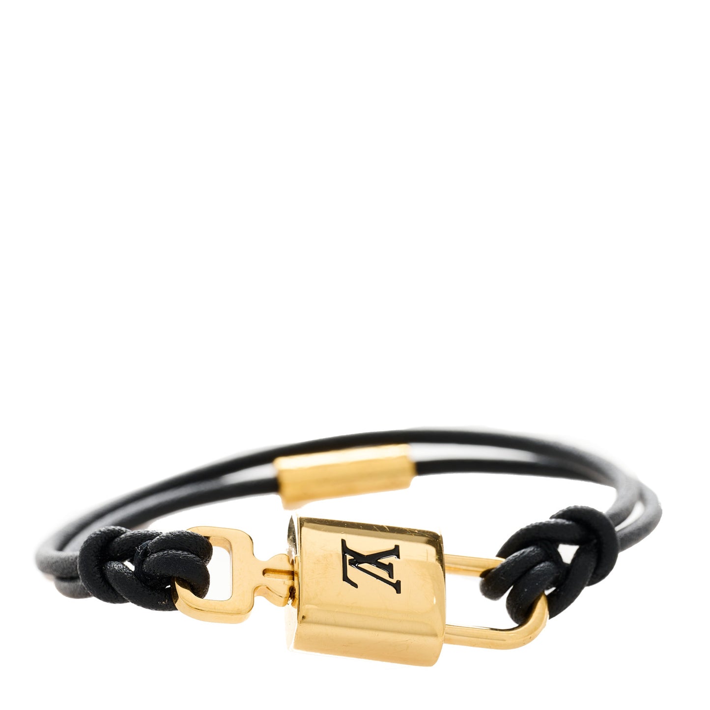 This is an authentic LOUIS VUITTON Calfskin LV Padlock Bracelet size 17 in Black. This stylish bracelet is two rolled loops of black leather with brass clasps in a decorative brass padlock motif.Follow this item for alerts. Louis Vuitton is a registered trademark of Louis Vuitton. FASHIONPHILE is not affiliated with Louis Vuitton.