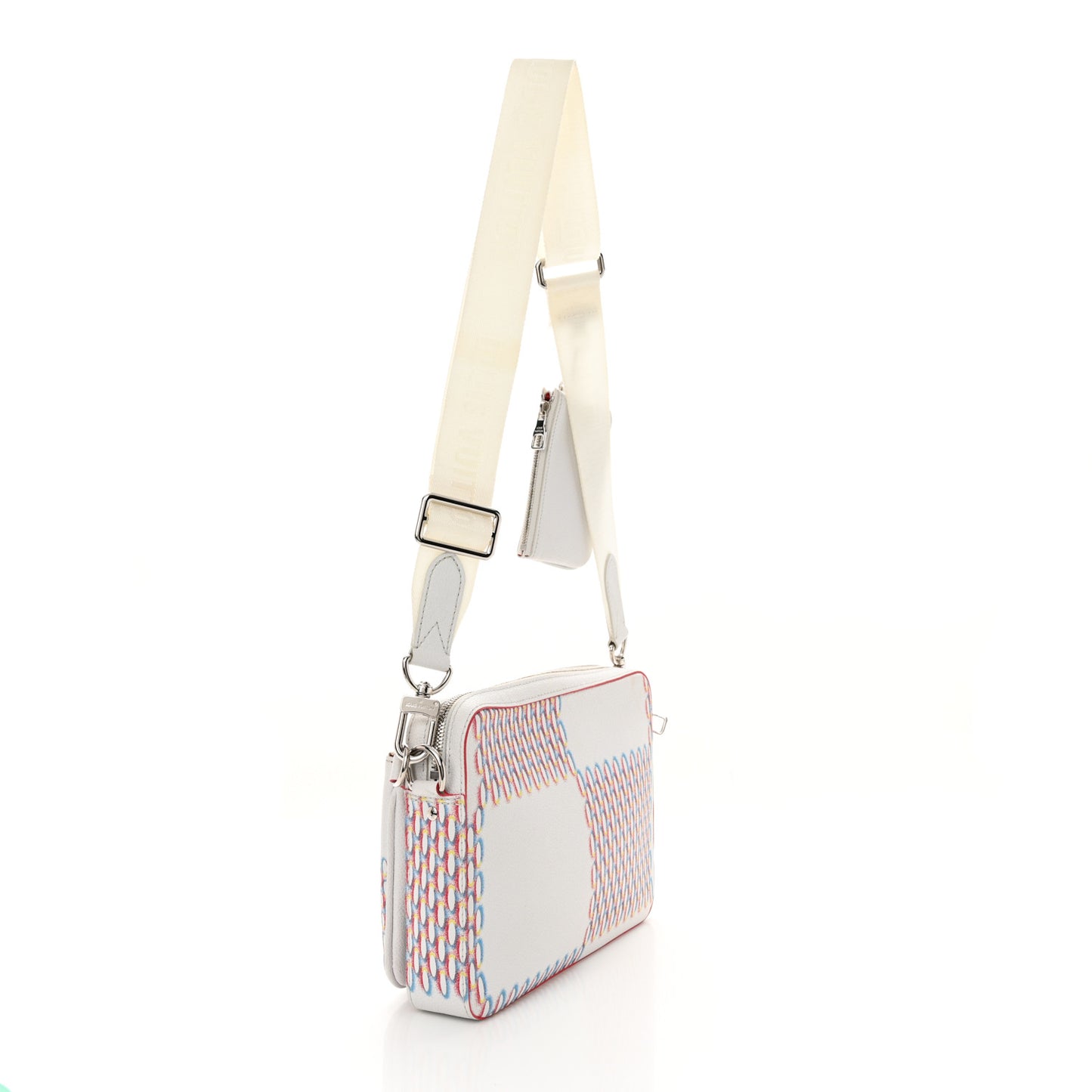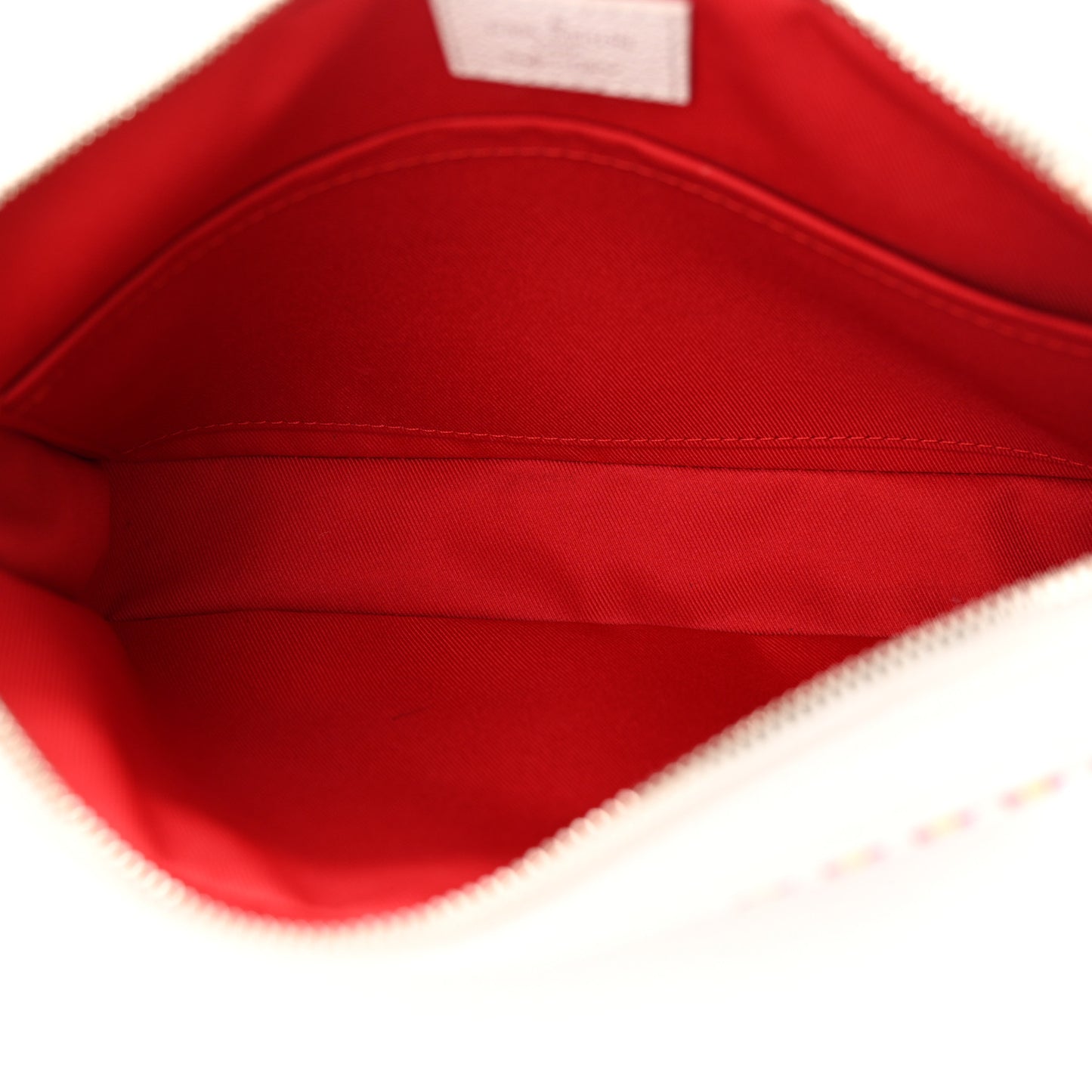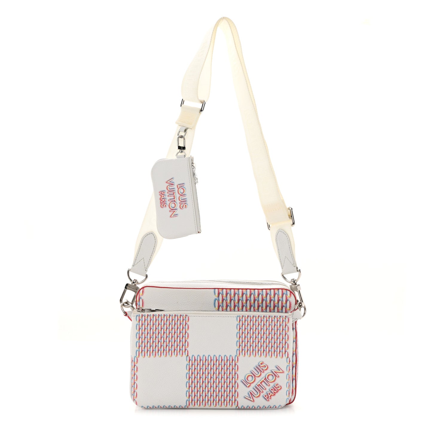 This is an authentic LOUIS VUITTON Cowhide Damier Spray Trio Messenger Bag in White. This chic messenger bag is crafted of cowhide leather in white with a bright artistic design. The shoulder bag features a nylon cross-body strap with silver adjustment buckles and links. The bag opens to a red fabric interior.Follow this item for alerts. Louis Vuitton is a registered trademark of Louis Vuitton. FASHIONPHILE is not affiliated with Louis Vuitton.