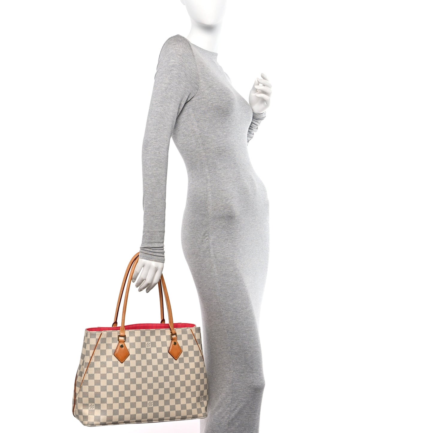 This is an authentic LOUIS VUITTON Damier Azur Calvi. This handbag is crafted of Louis Vuitton damier blue and white checkered canvas. This shoulder bag features button snap expandable sides, vachetta cowhide leather trim, and rolled vachetta leather top handles with polished brass hardware. The bag has a broad top opening to a partitioned bright pink striped fabric interior with pockets.Follow this item for alerts. Louis Vuitton is a registered trademark of Louis Vuitton. FASHIONPHILE is not affiliated with Louis Vuitton.