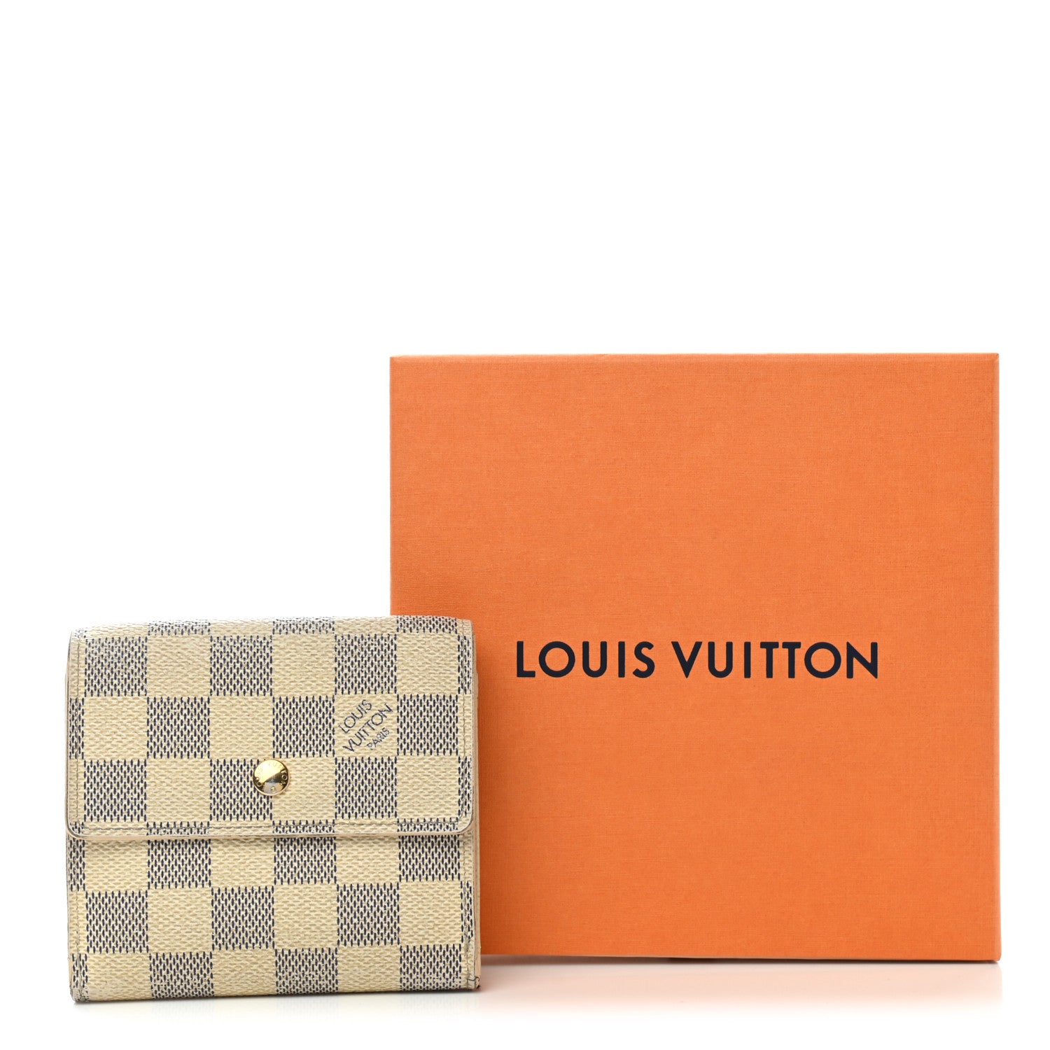 This is an authentic LOUIS VUITTON Damier Azur Elise Wallet. This wallet is crafted of Louis Vuitton signature damier coated canvas with a frontal flap. The snap opens to an interior of ivory cross-grain leather lining, credit card slots, and cash compartment. The reverse side has a snap coin purse with accordion sides.Follow this item for alerts. Louis Vuitton is a registered trademark of Louis Vuitton. FASHIONPHILE is not affiliated with Louis Vuitton.