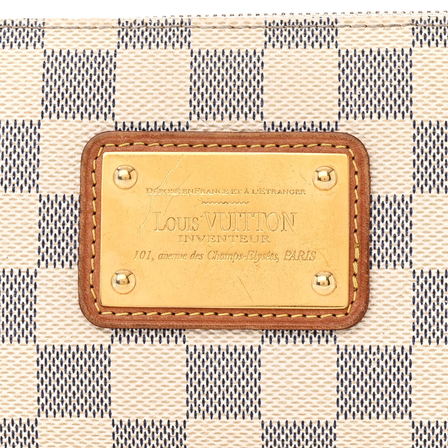 This is an authentic LOUIS VUITTON Damier Azur Eva Clutch. This chic clutch is crafted of Louis Vuitton's signature Damier coated canvas in white and blue. This versatile handbag features a polished gold plated chain-link wristlet strap, an optional vachetta leather shoulder strap, and a gold plated top zipper that opens to a beige canvas interior.Follow this item for alerts. Louis Vuitton is a registered trademark of Louis Vuitton. FASHIONPHILE is not affiliated with Louis Vuitton.