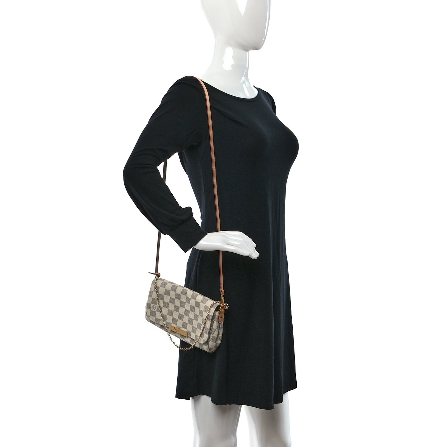 This is an authentic LOUIS VUITTON Damier Azur Favorite PM. This shoulder bag is crafted of Louis Vuitton Damier checked coated canvas in blue and white. This bag can be worn with the removable vachetta cowhide leather shoulder strap or with the polished brass chain wrist strap. The wrist strap has a clip on one end that can be attached to the D-ring of a larger bag. This bag also features matching Damier piping and a flap trimmed with a Louis Vuitton logo plate in brass. The flap opens to a beige canvas fabric lining with a patch pocket.Follow this item for alerts. Louis Vuitton is a registered trademark of Louis Vuitton. FASHIONPHILE is not affiliated with Louis Vuitton.