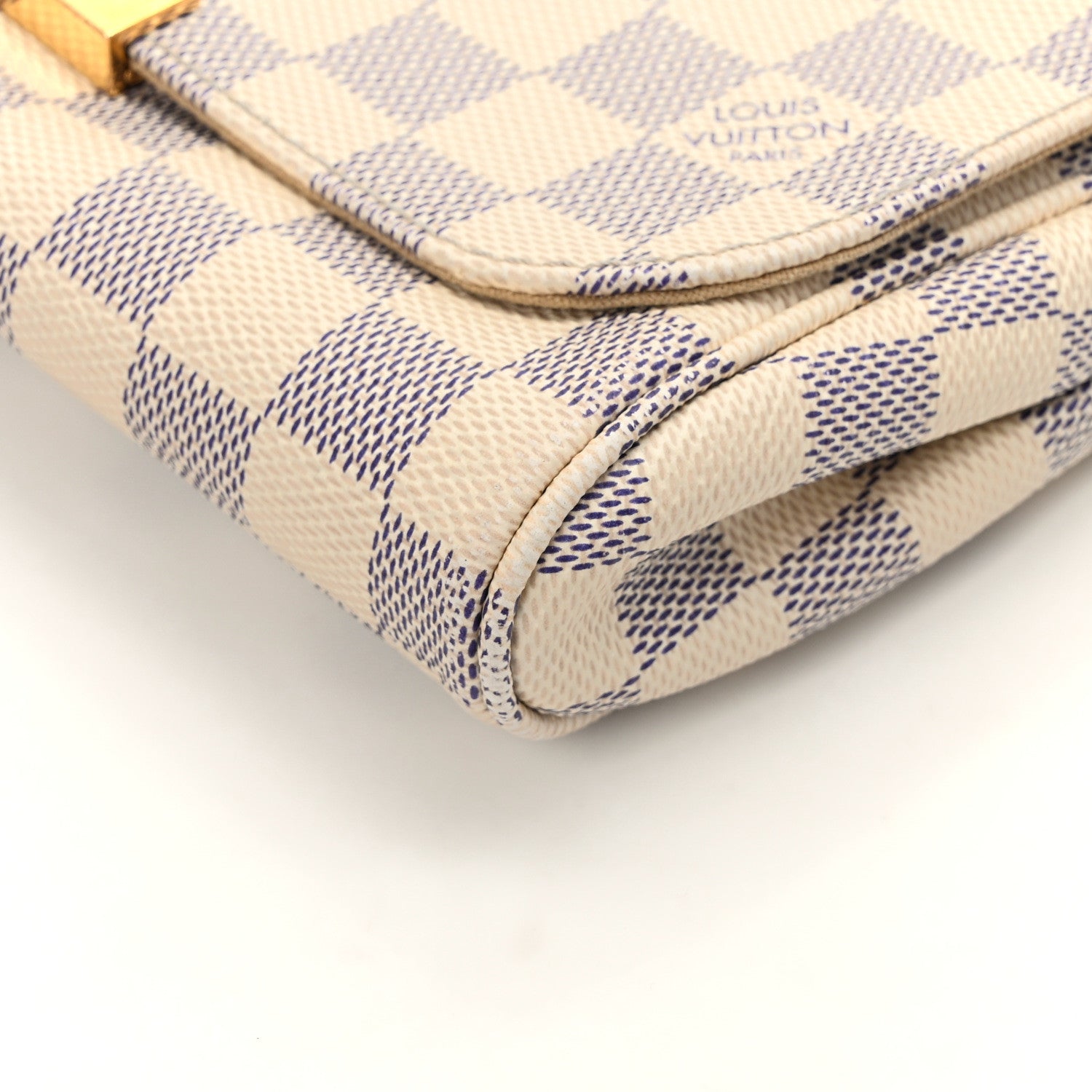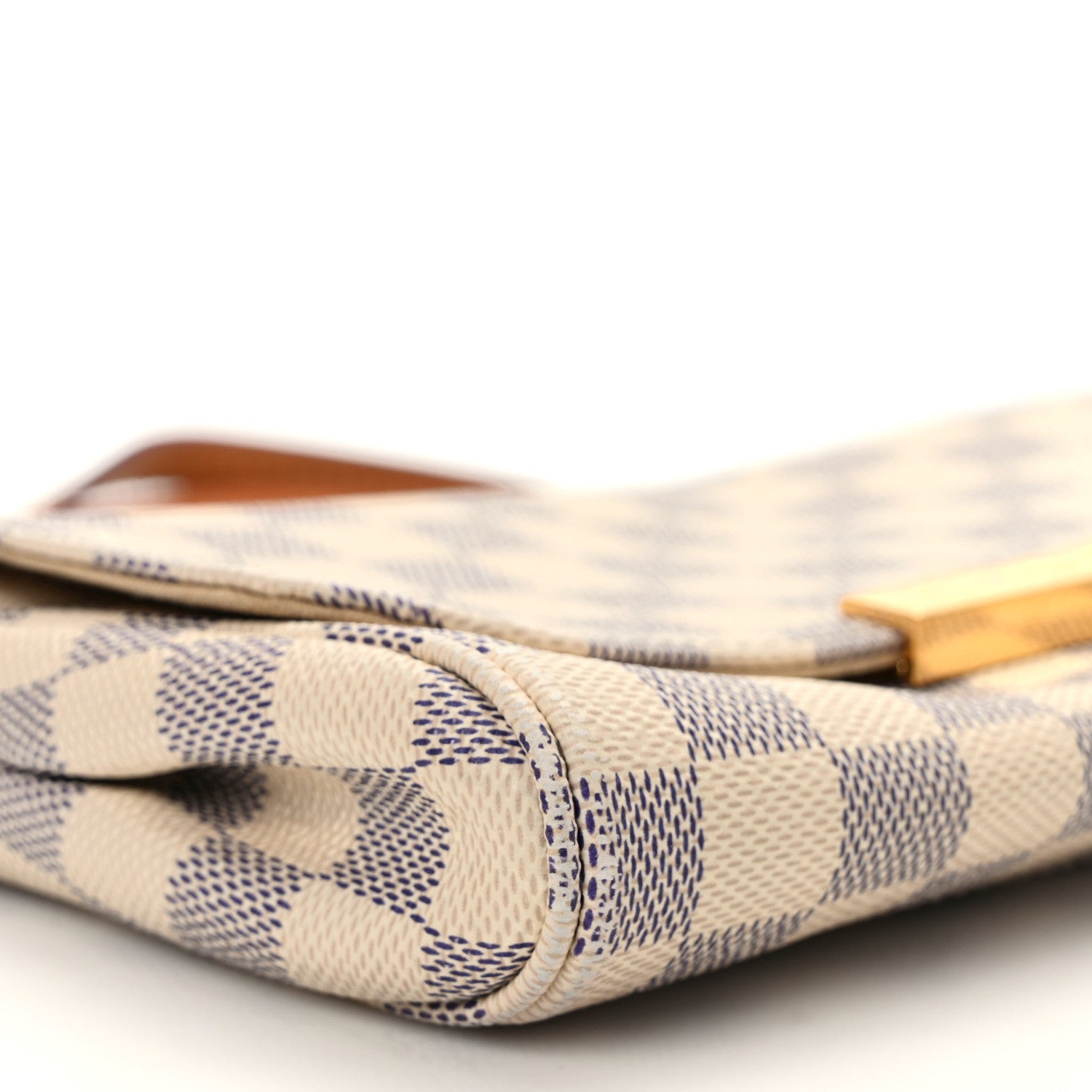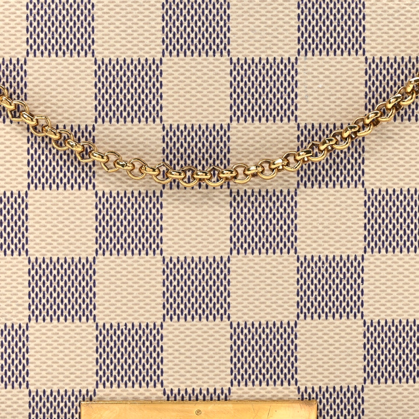 This is an authentic LOUIS VUITTON Damier Azur Favorite PM. This stylish shoulder bag is crafted of Louis Vuitton damier checked coated canvas in blue and white. The shoulder bag features a gold wristlet chain, an optional vachetta leather shoulder strap, damier piping and a flap trimmed with a Louis Vuitton logo plate in polished gold. The flap opens to a beige canvas fabric lining with a flat pocket.