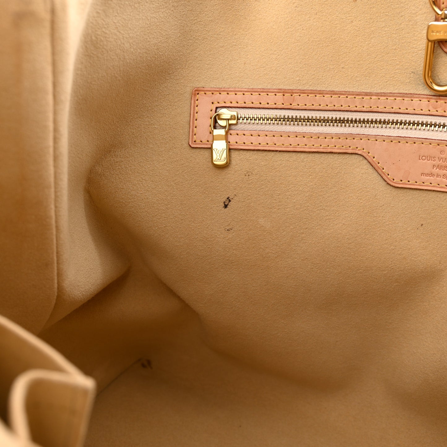 Exterior: Corner wear, creases, patina of vachetta, wear at resin glazing, liquid marks, faint scuffs