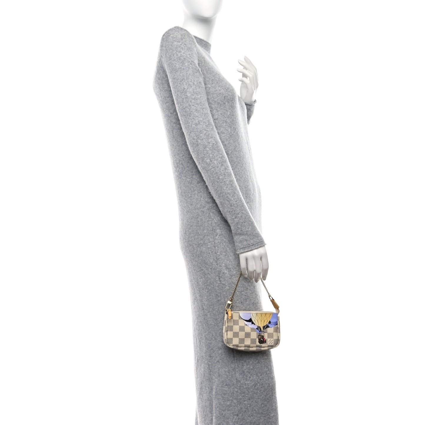This is the authentic LOUIS VUITTON Damier Azur Illustre Mini Pochette Accessories. This small accessory pouch is crafted of damier azur coated canvas with an overlay print of air balloons and an LV trunk. The bag features a gold-tone chain wrist strap with a clasp at one end for attaching to your handbag.Follow this item for alerts. Louis Vuitton is a registered trademark of Louis Vuitton. FASHIONPHILE is not affiliated with Louis Vuitton.