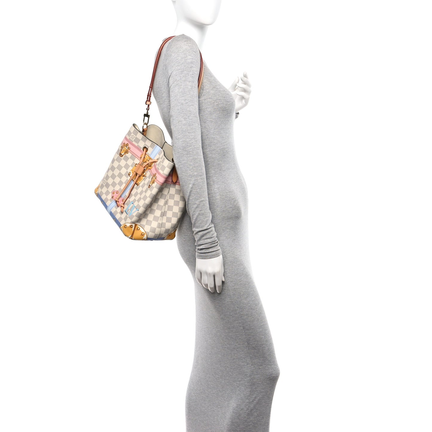 This is an authentic LOUIS VUITTON Damier Azur Summer Trunks Neonoe. This classic bucket style shoulder bag is crafted of Louis Vuitton Damier coated canvas in white and blue with a pastel-colored summer trunk design overlay in pink, blue, and yellow. The shoulder bag features a vachetta shoulder strap and top cinch strap with polished brass hardware. This opens to a beige microfiber interior and matching canvas center zip pocket to keep you organized.