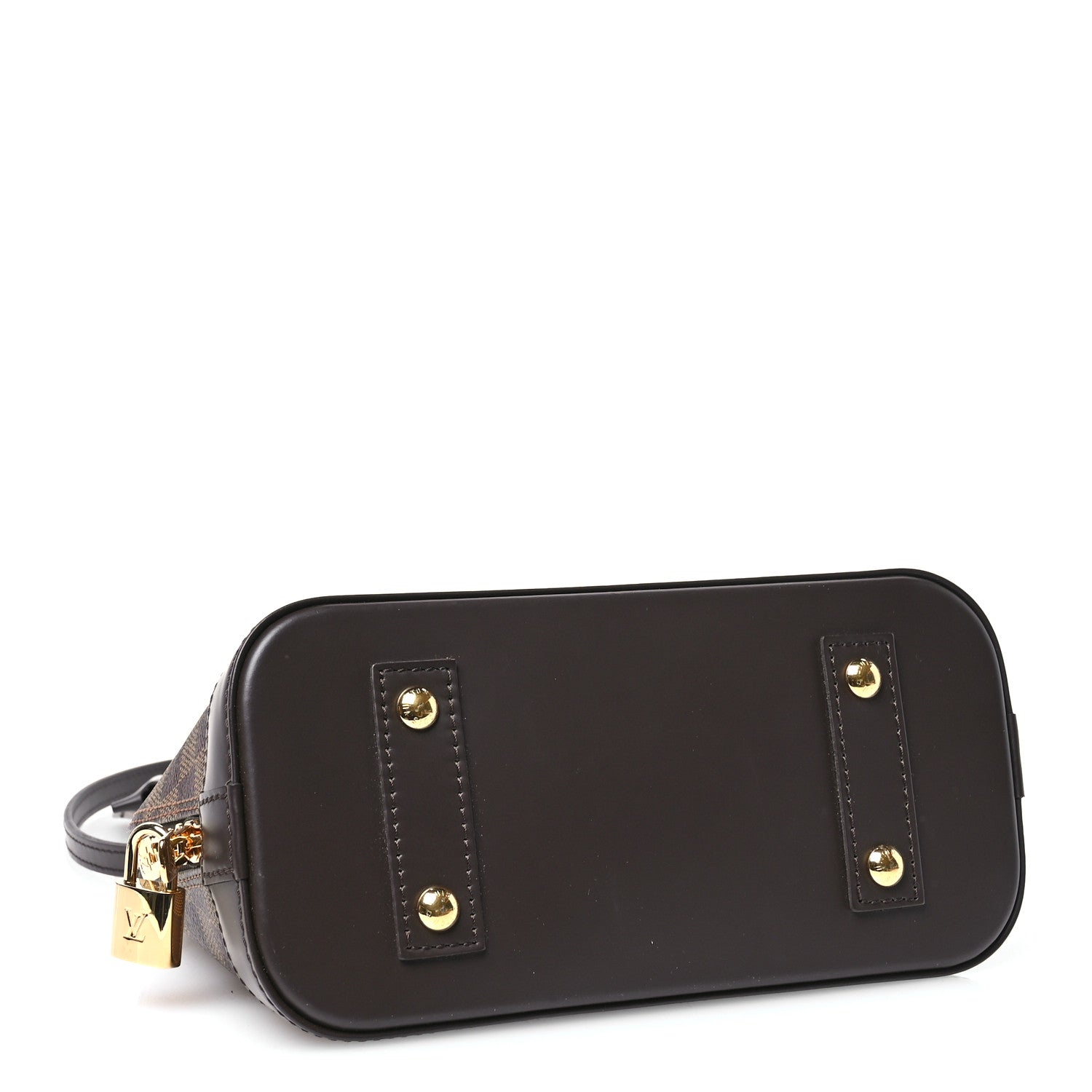 This is an authentic LOUIS VUITTON Damier Ebene Alma BB. This mini bowling-style handbag is crafted of Louis Vuitton's signature Damier coated canvas in brown. The bag features beautiful brown cowhide leather trim including a solid base, rolled top handles, an optional shoulder strap, a gold hot stamped initials on clochette "D," and brass hardware. The wrap-around zippers open to a red fabric interior with a patch pocket.Follow this item for alerts. Louis Vuitton is a registered trademark of Louis Vuitton. FASHIONPHILE is not affiliated with Louis Vuitton.