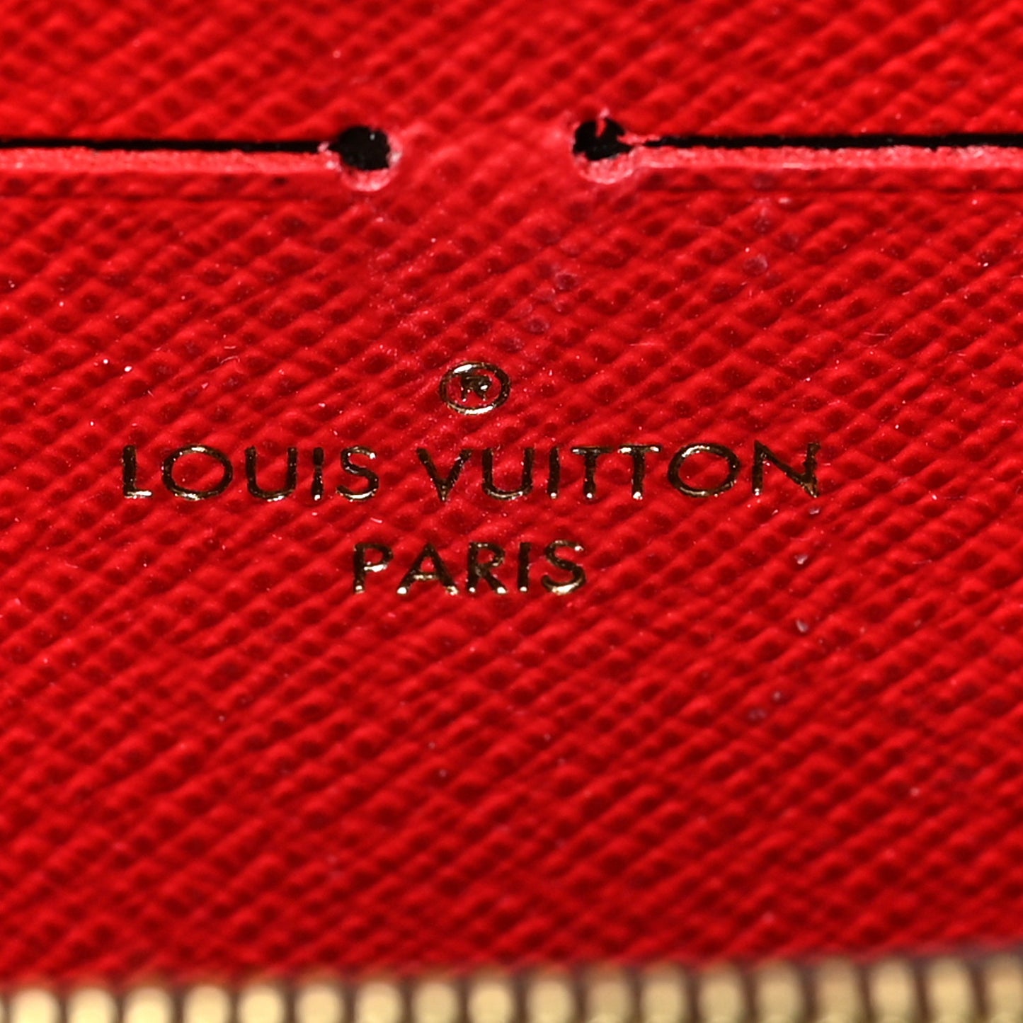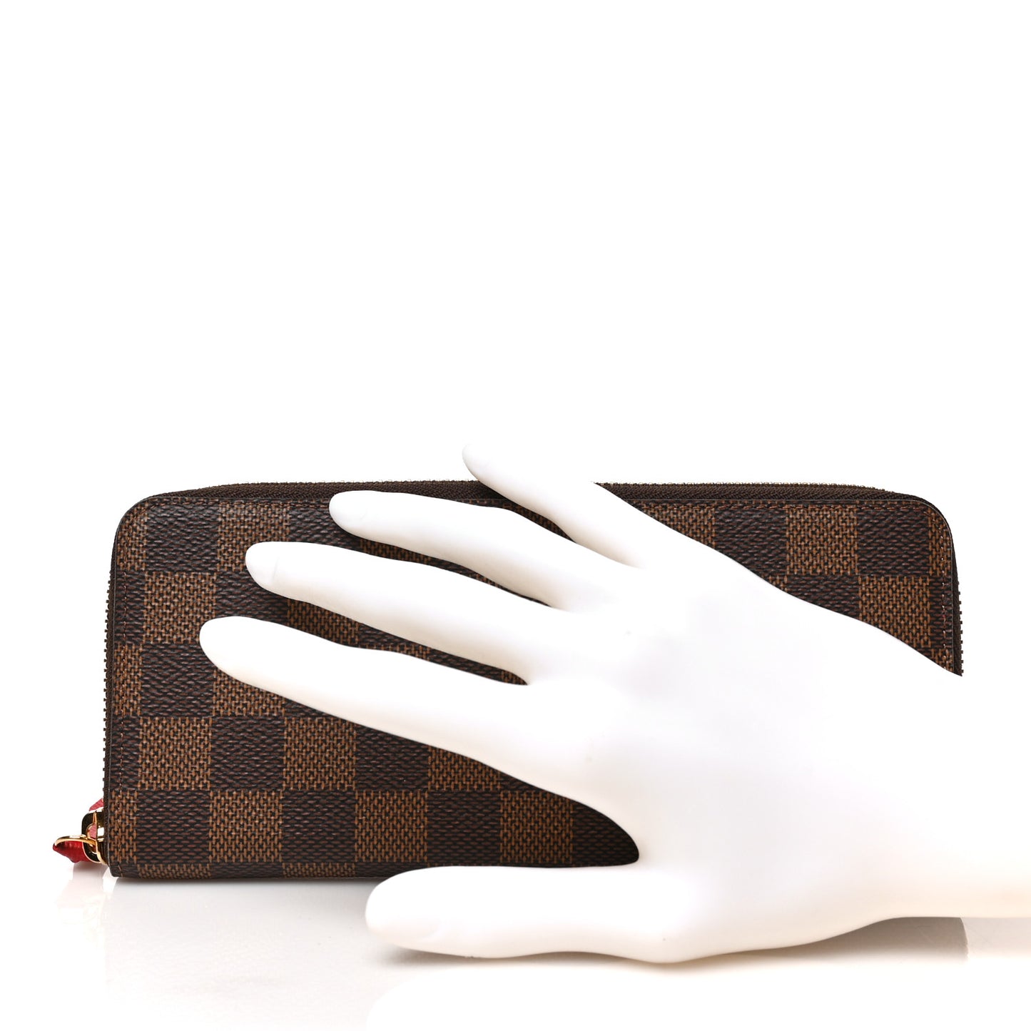 This is an authentic LOUIS VUITTON Damier Ebene Clemence Wallet in Cherry. This stylish wallet is constructed of traditional damier ebene toile canvas. The 3/4 wrap-around gold zipper and cherry leather pull tab open to a partitioned interior in vibrant red cross-grain leather, featuring two red leather card slot panels, patch pockets, and a central damier ebene zipper coin compartment.Follow this item for alerts. Louis Vuitton is a registered trademark of Louis Vuitton. FASHIONPHILE is not affiliated with Louis Vuitton.