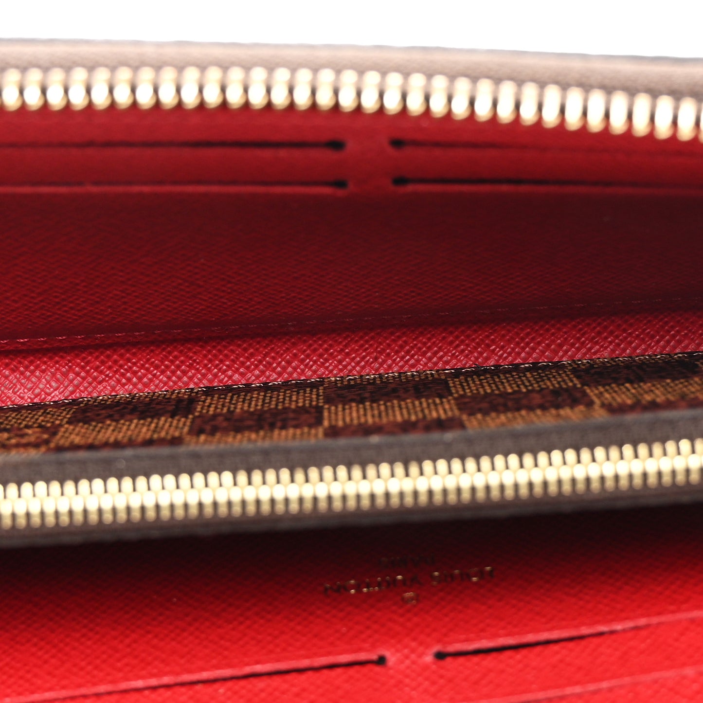 This is an authentic LOUIS VUITTON Damier Ebene Clemence Wallet in Cherry. This stylish wallet is crafted of traditional damier ebene toile canvas. The 3/4 wrap-around gold zipper and cherry leather pull tab open to a partitioned interior in vibrant red cross-grain leather, featuring two red leather card slots, patch pockets, and a central damier ebene zipper coin compartment.Follow this item for alerts. Louis Vuitton is a registered trademark of Louis Vuitton. FASHIONPHILE is not affiliated with Louis Vuitton.