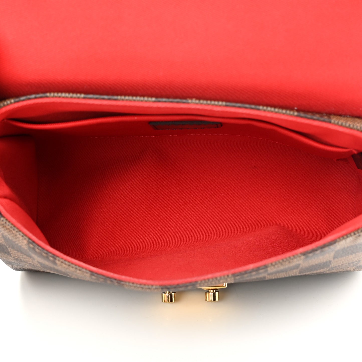 This is an authentic LOUIS VUITTON Damier Ebene in Croisette. This compact handbag is crafted of Louis Vuitton checkerboard canvas in brown. This bag features a dark brown cowhide leather top handle, an optional shoulder strap, and brass hardware. The front flap is secured by a brass S-lock and opens to a rouge red fabric interior with a patch pocket.Follow this item for alerts. Louis Vuitton is a registered trademark of Louis Vuitton. FASHIONPHILE is not affiliated with Louis Vuitton.