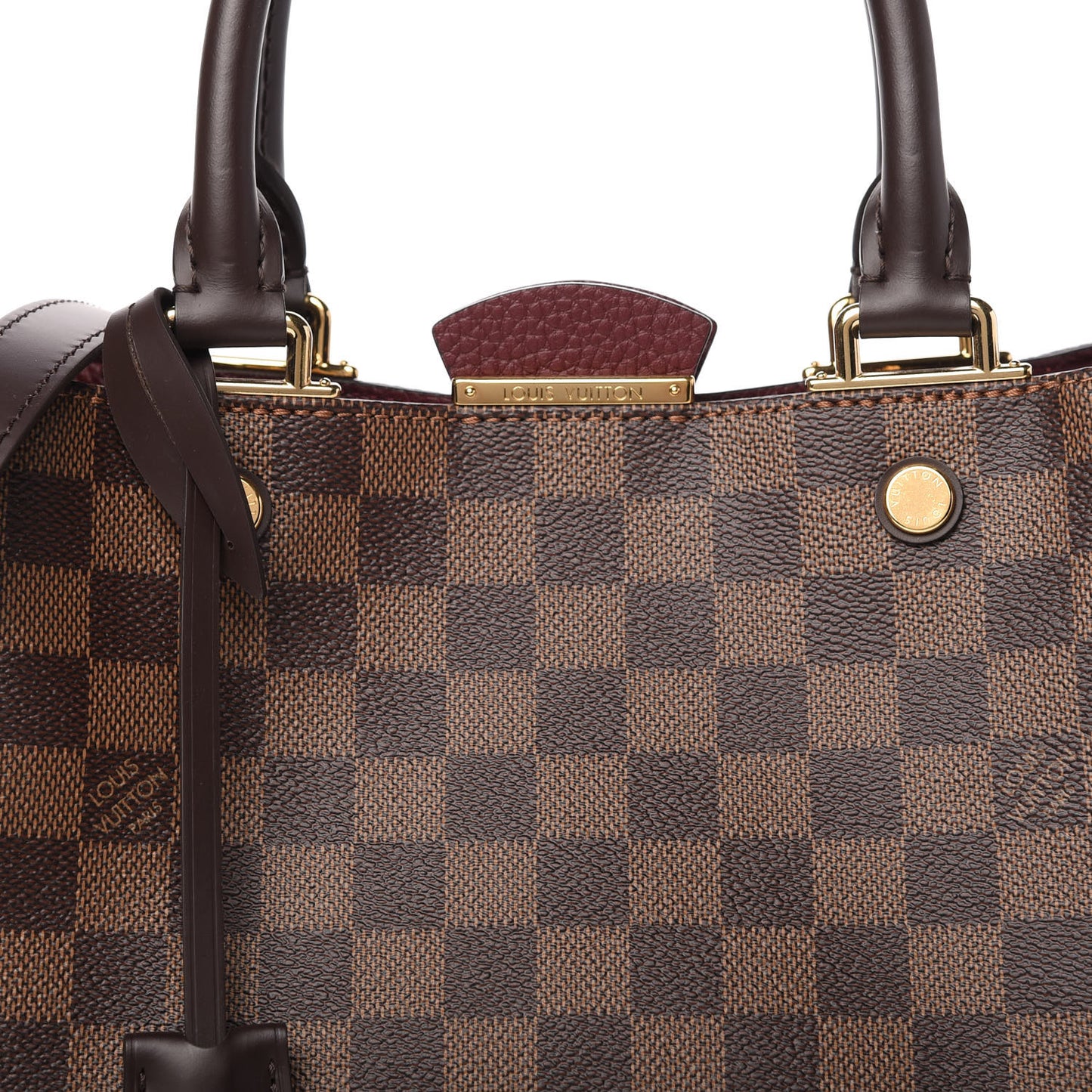 This is an authentic LOUIS VUITTON Damier Ebene Cuir Taurillon Brittany in Bordeaux. This chic tote is crafted of Louis Vuitton monogram on toile canvas with burgundy wide sides that gather and pleat at the top with a top peek a boo side of burgundy leather. The bag features rolled treated cowhide leather top handles with brass links and an optional brown leather shoulder strap with brass clasps. The top zipper opens to a burgundy partitioned microfiber interior with a central zipper compartment and patch pockets for enough room for all of your necessities with the luxury and style of Louis Vuitton!Follow this item for alerts. Louis Vuitton is a registered trademark of Louis Vuitton. FASHIONPHILE is not affiliated with Louis Vuitton.