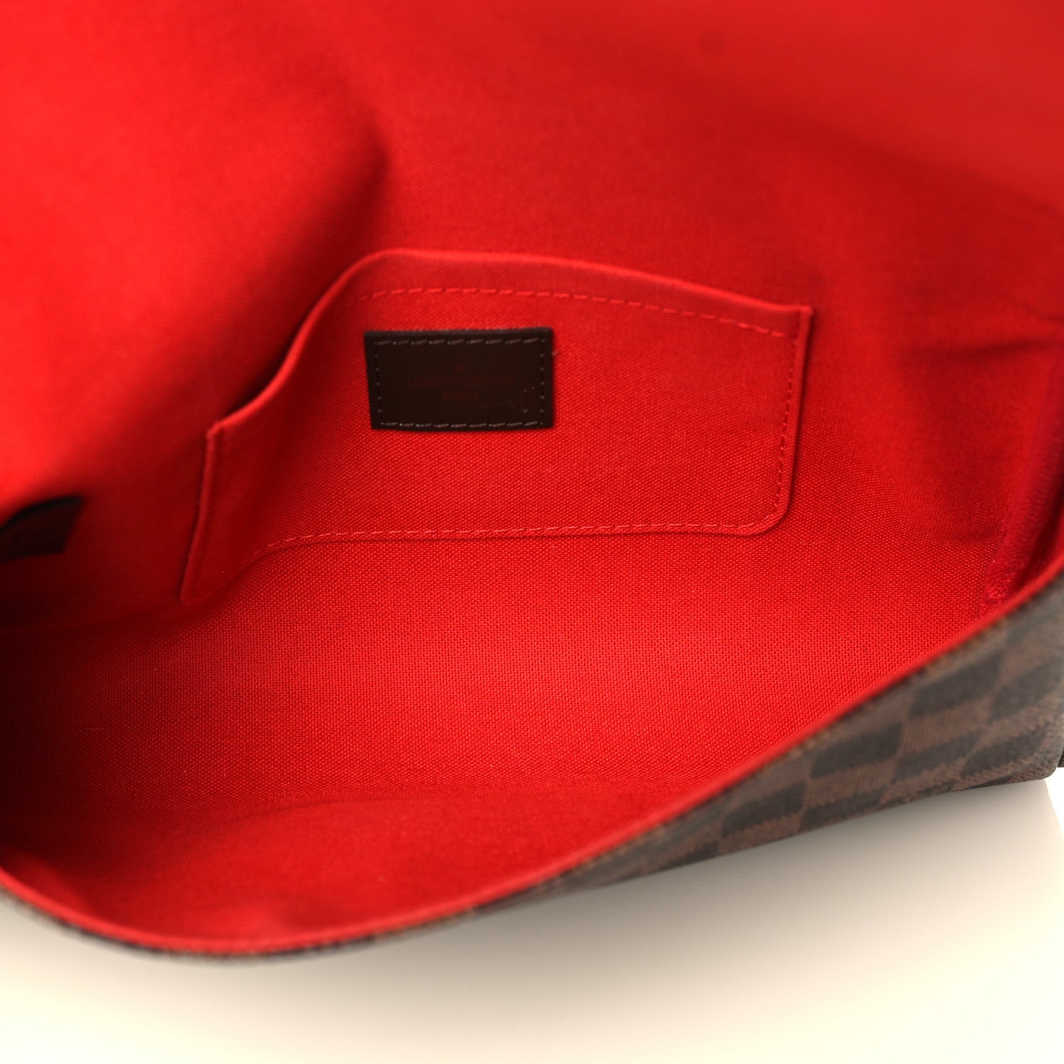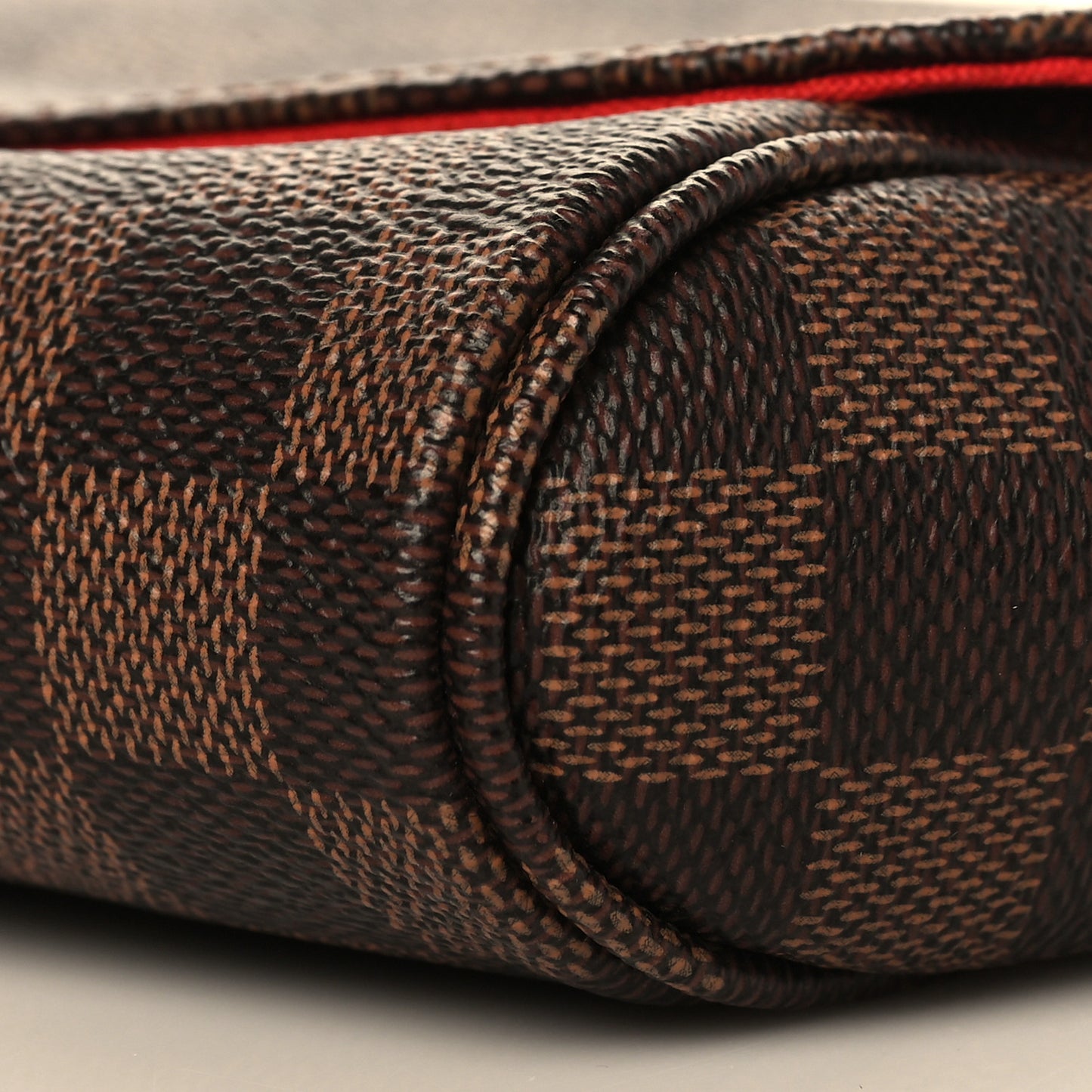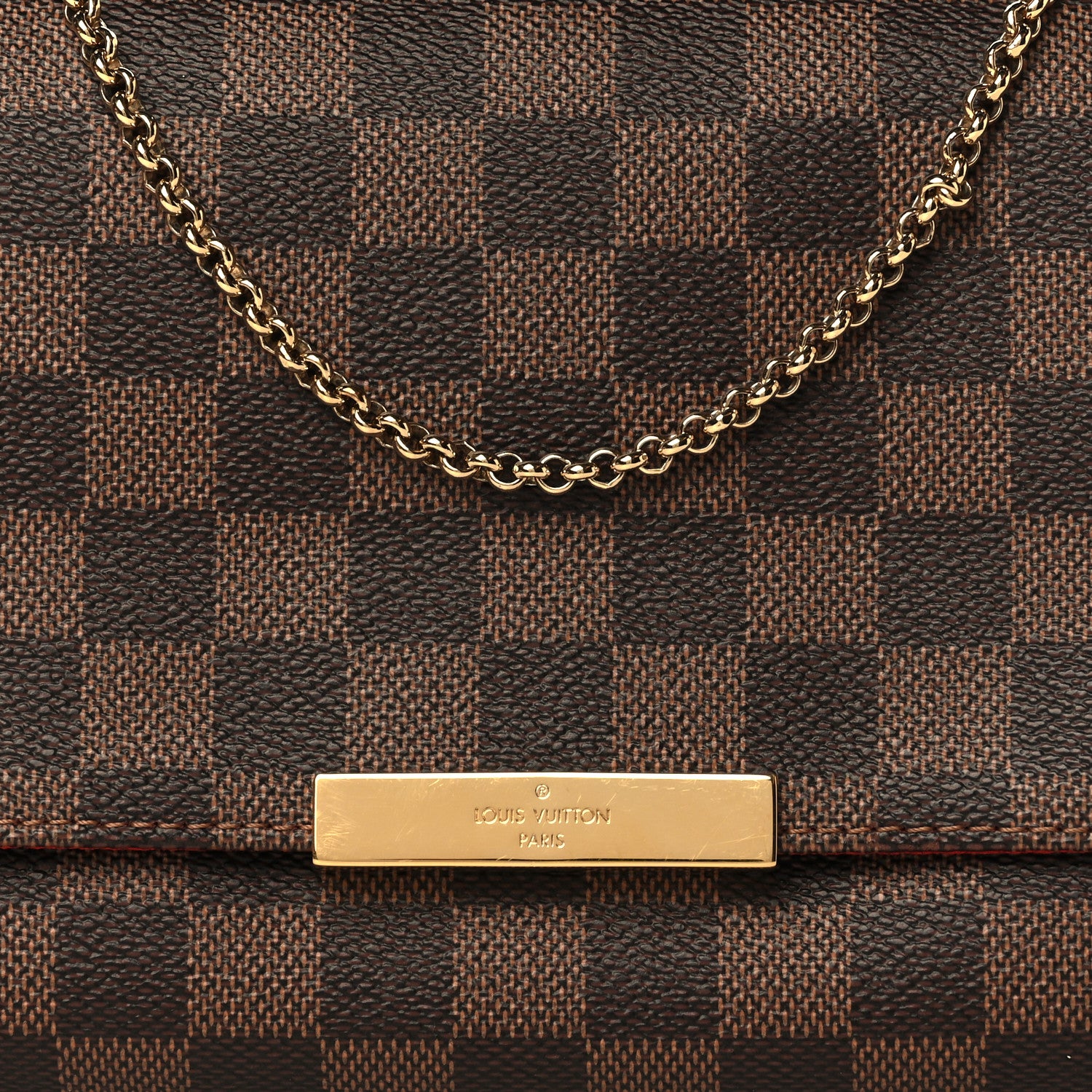 This is an authentic LOUIS VUITTON Damier Ebene Favorite MM. This stylish bag is crafted of durable Louis Vuitton Damier coated canvas in brown. This shoulder bag features a short polished brass chain strap and an optional long brown leather shoulder strap. The flap opens with a magnetic brass bar to a red canvas fabric lining with a pocket.Follow this item for alerts. Louis Vuitton is a registered trademark of Louis Vuitton. FASHIONPHILE is not affiliated with Louis Vuitton.
