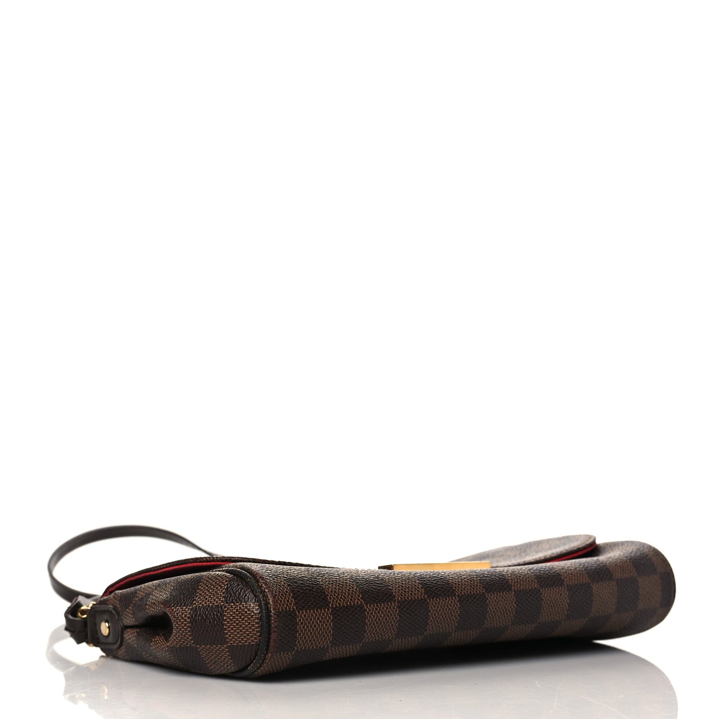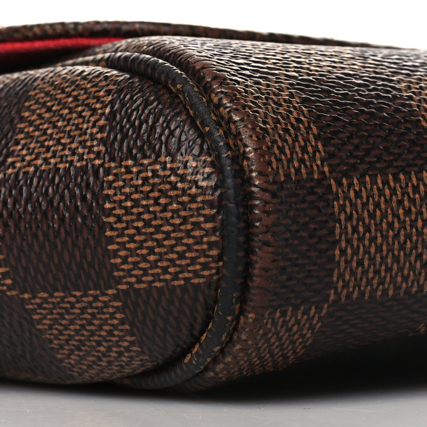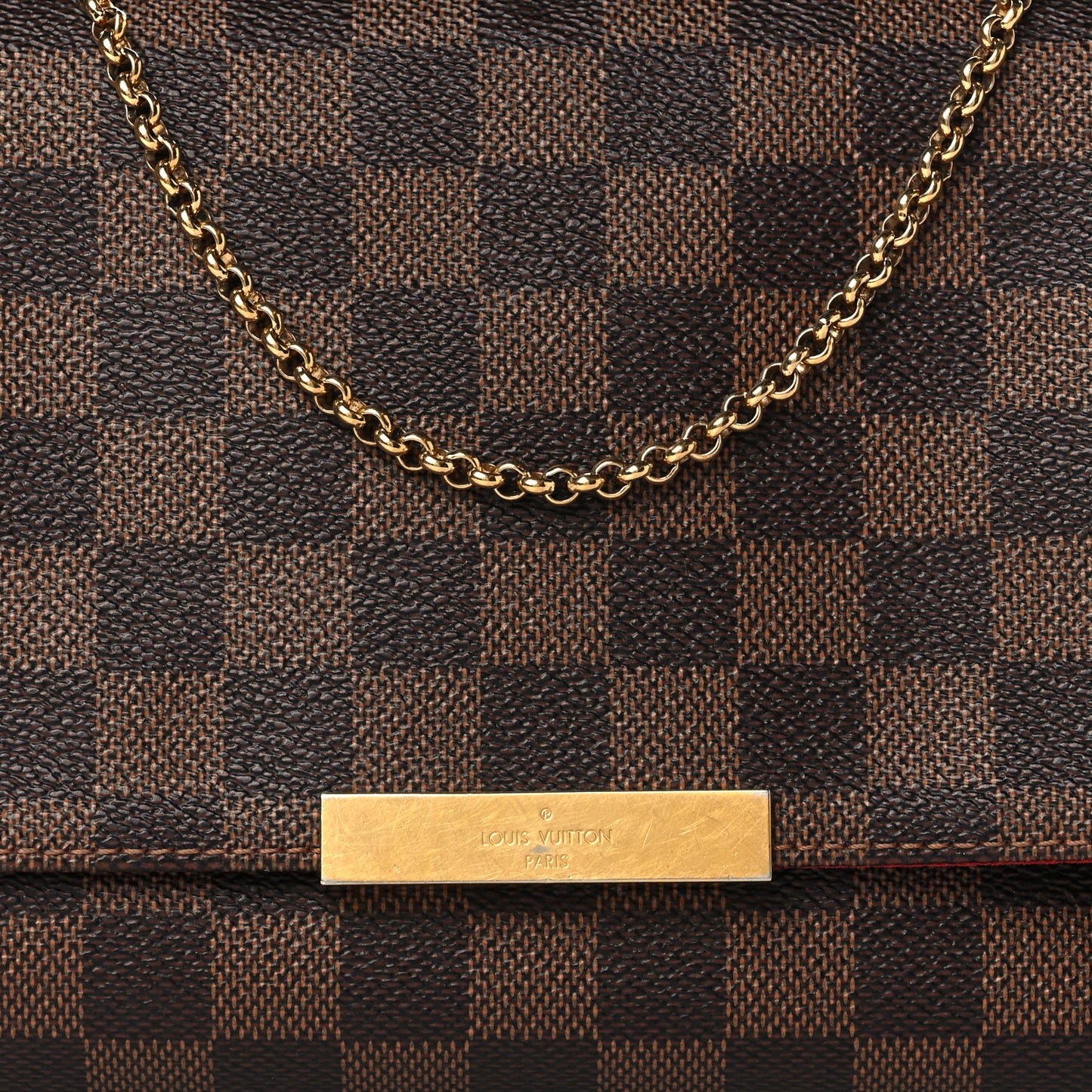This is an authentic LOUIS VUITTON Damier Ebene Favorite MM. This stylish bag is crafted of durable Louis Vuitton Damier coated canvas in brown. This shoulder bag features a short polished brass chain strap and an optional long brown leather shoulder strap. The flap opens with a magnetic brass bar to a red canvas fabric lining with a pocket.Follow this item for alerts. Louis Vuitton is a registered trademark of Louis Vuitton. FASHIONPHILE is not affiliated with Louis Vuitton.