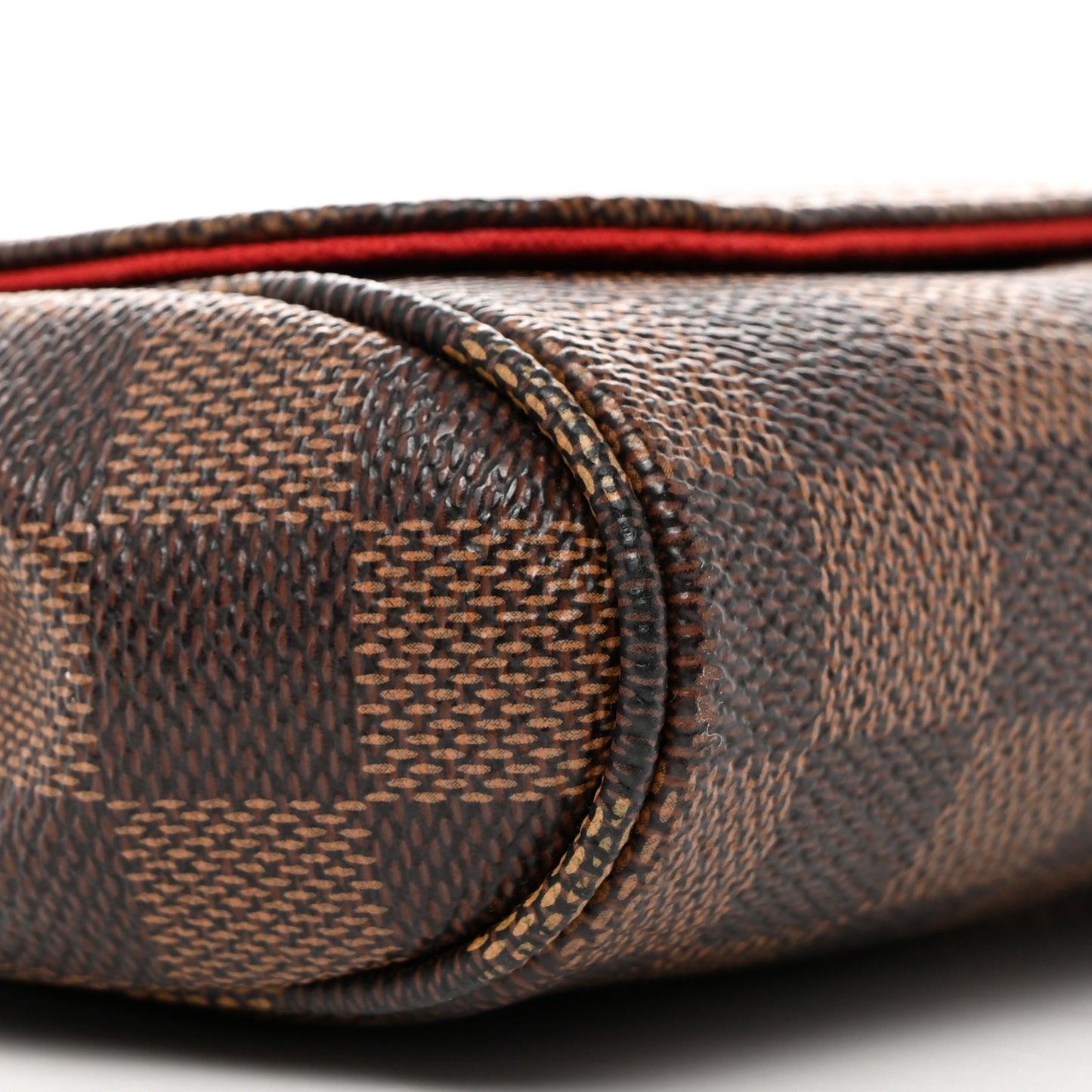 This is an authentic LOUIS VUITTON Damier Ebene Favorite MM. This stylish bag is crafted of classic Damier toile canvas. The shoulder bag features a polished brass chain-link wristlet strap and an optional leather crossbody strap. The crossover flap opens with a magnetic brass bar to a red fabric interior with a patch pocket.