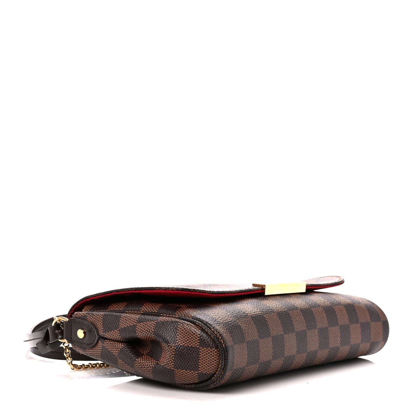 This is an authentic LOUIS VUITTON Damier Ebene Favorite MM. This stylish bag is crafted of classic Damier toile canvas. The shoulder bag features a polished brass chain-link wristlet strap and an optional leather crossbody strap. The crossover flap opens with a magnetic brass bar to a red fabric interior with a patch pocket.