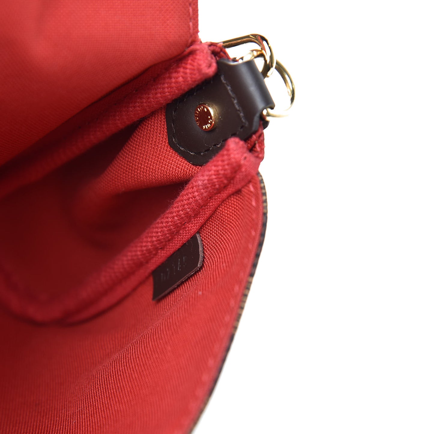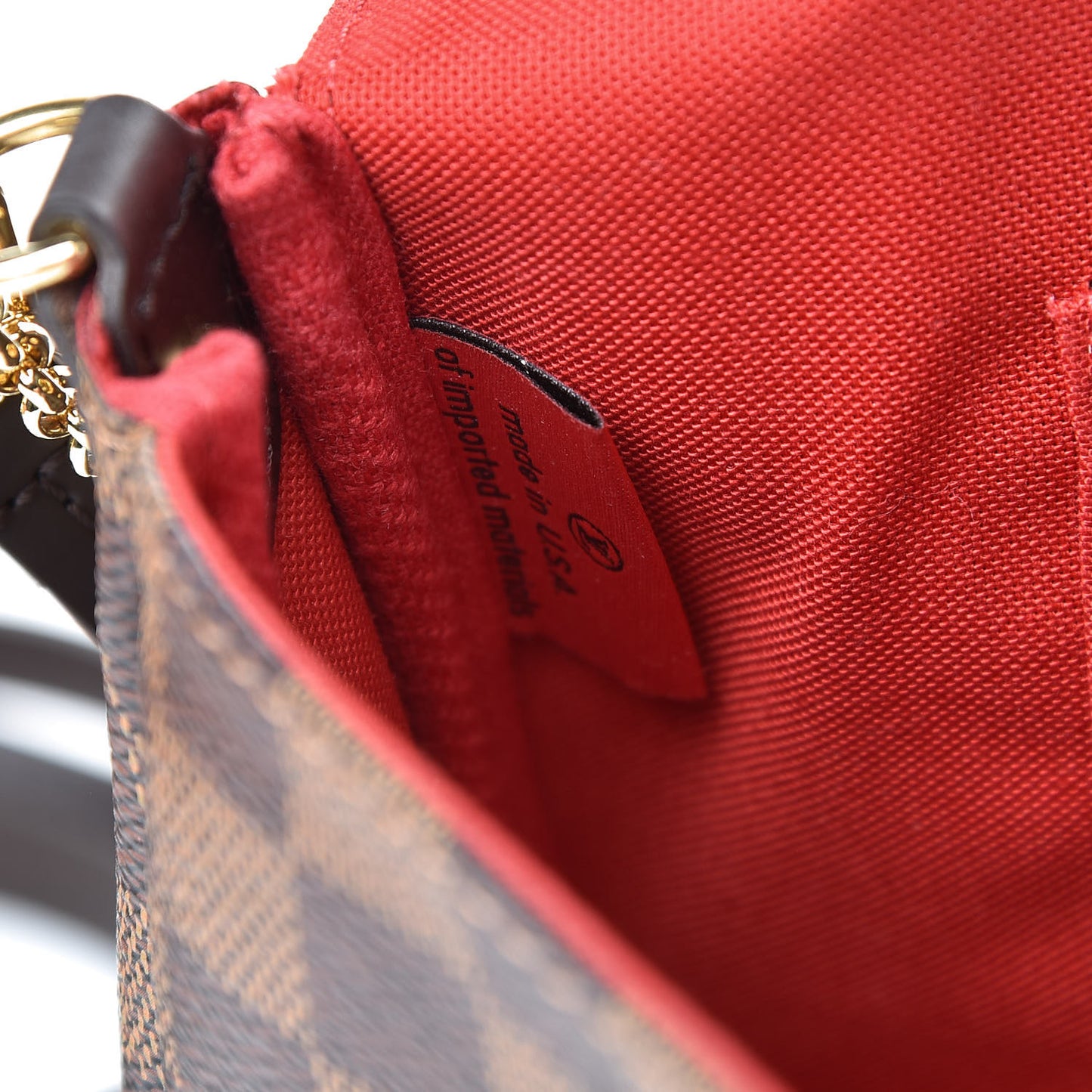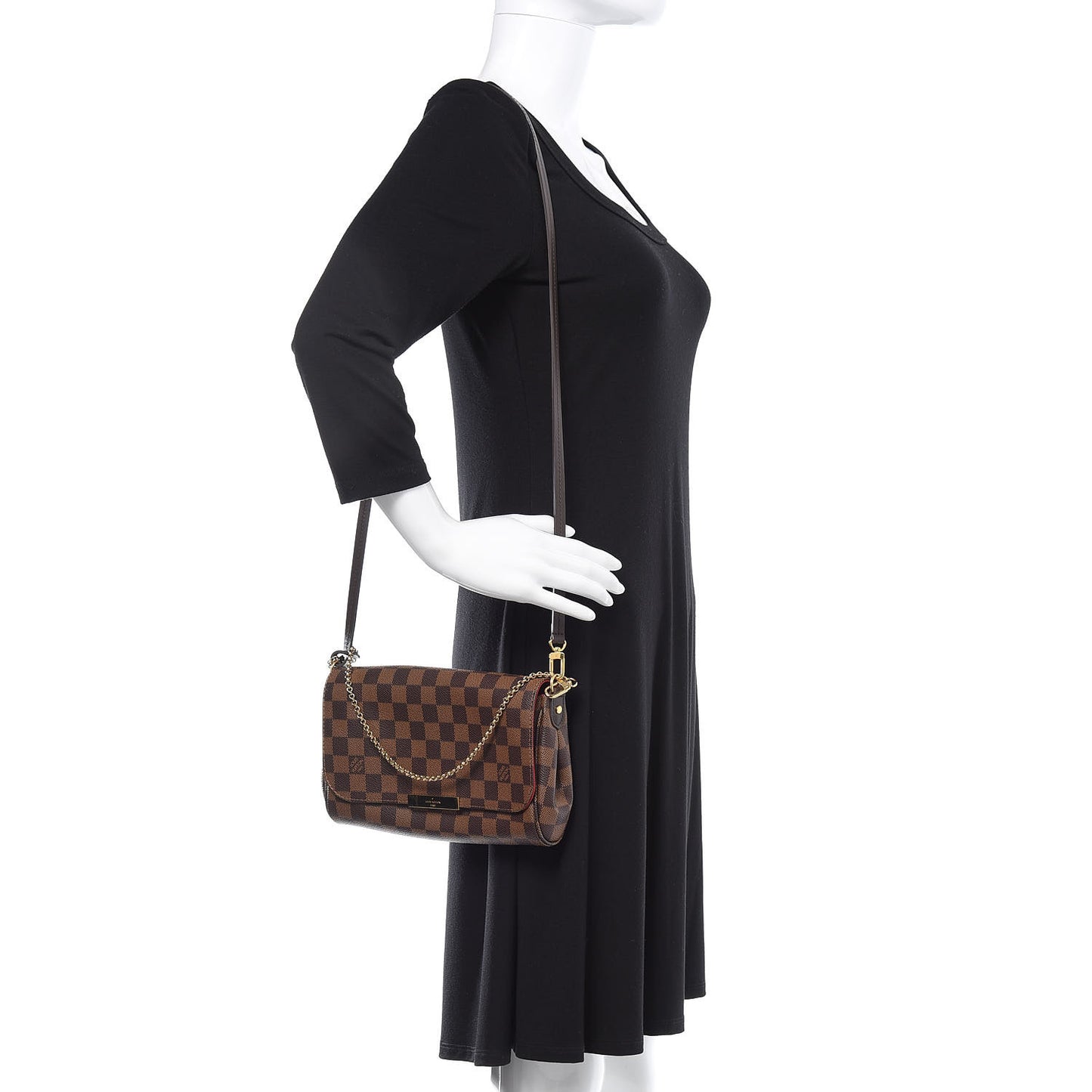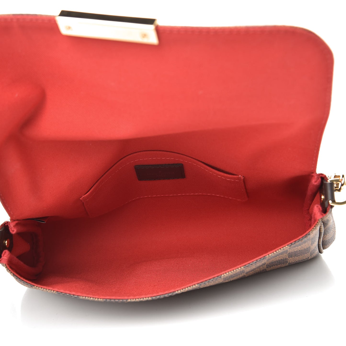 This is an authentic LOUIS VUITTON Damier Ebene Favorite MM. This stylish bag is crafted of durable damier toile canvas with a polished brass chain strap and an optional leather shoulder strap. The front flap opens with a magnetic brass bar to a red fabric interior with a patch pocket. This is a stylish bag for day or evening wear, from Louis Vuitton!