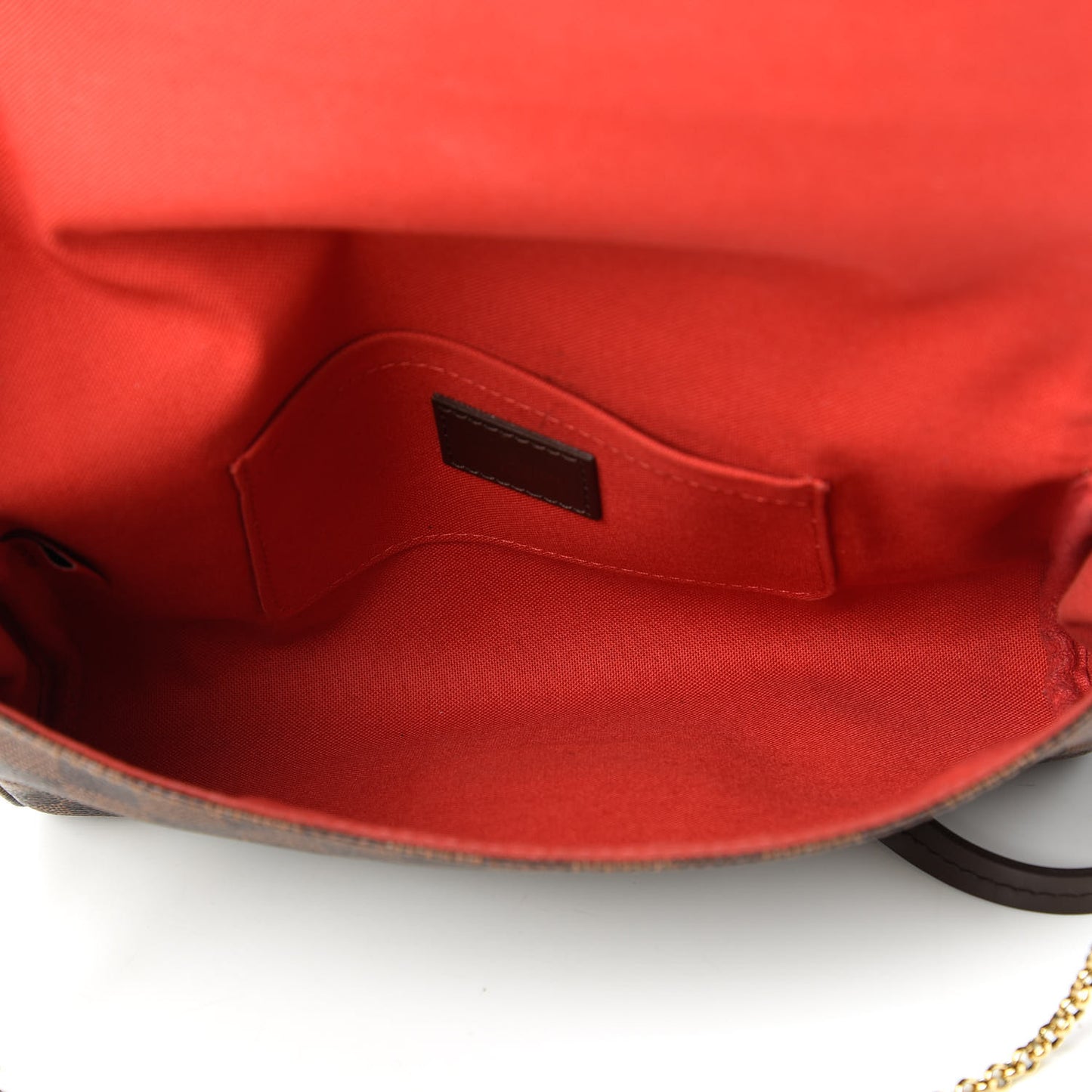 This is an authentic LOUIS VUITTON Damier Ebene Favorite MM. This stylish bag is crafted of classic Damier toile canvas. The shoulder bag features a polished brass chain-link wristlet strap and an optional brown leather crossbody strap. The crossover flap opens with a magnetic brass bar to a red fabric interior with a patch pocket.Follow this item for alerts. Louis Vuitton is a registered trademark of Louis Vuitton. FASHIONPHILE is not affiliated with Louis Vuitton.