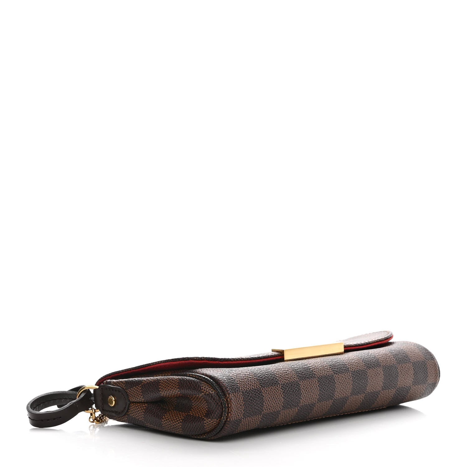 This is an authentic LOUIS VUITTON Damier Ebene Favorite PM. This bag is crafted of durable damier toile canvas. The bag features a polished brass chain strap and an optional leather shoulder strap. The front flap opens with a magnetic brass bar to a plum purple fabric interior with a patch pocket.Follow this item for alerts. Louis Vuitton is a registered trademark of Louis Vuitton. FASHIONPHILE is not affiliated with Louis Vuitton.