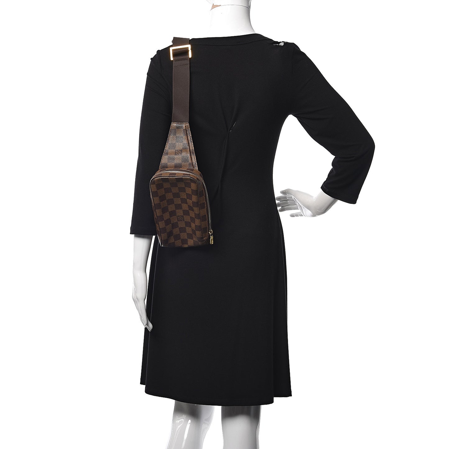 This is an authentic LOUIS VUITTON Damier Ebene Geronimos. This versatile bag is crafted of Ebene Damier canvas. This bag features a wrap around double zip closure, gold hardware, a flat pocket on the back and a concealed snap pocket on the strap. The zipper opens to a terracotta fabric interior.Follow this item for alerts. Louis Vuitton is a registered trademark of Louis Vuitton. FASHIONPHILE is not affiliated with Louis Vuitton.
