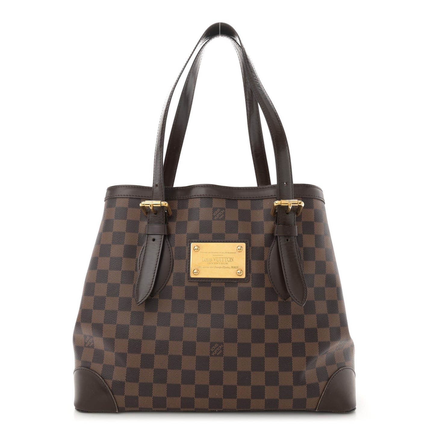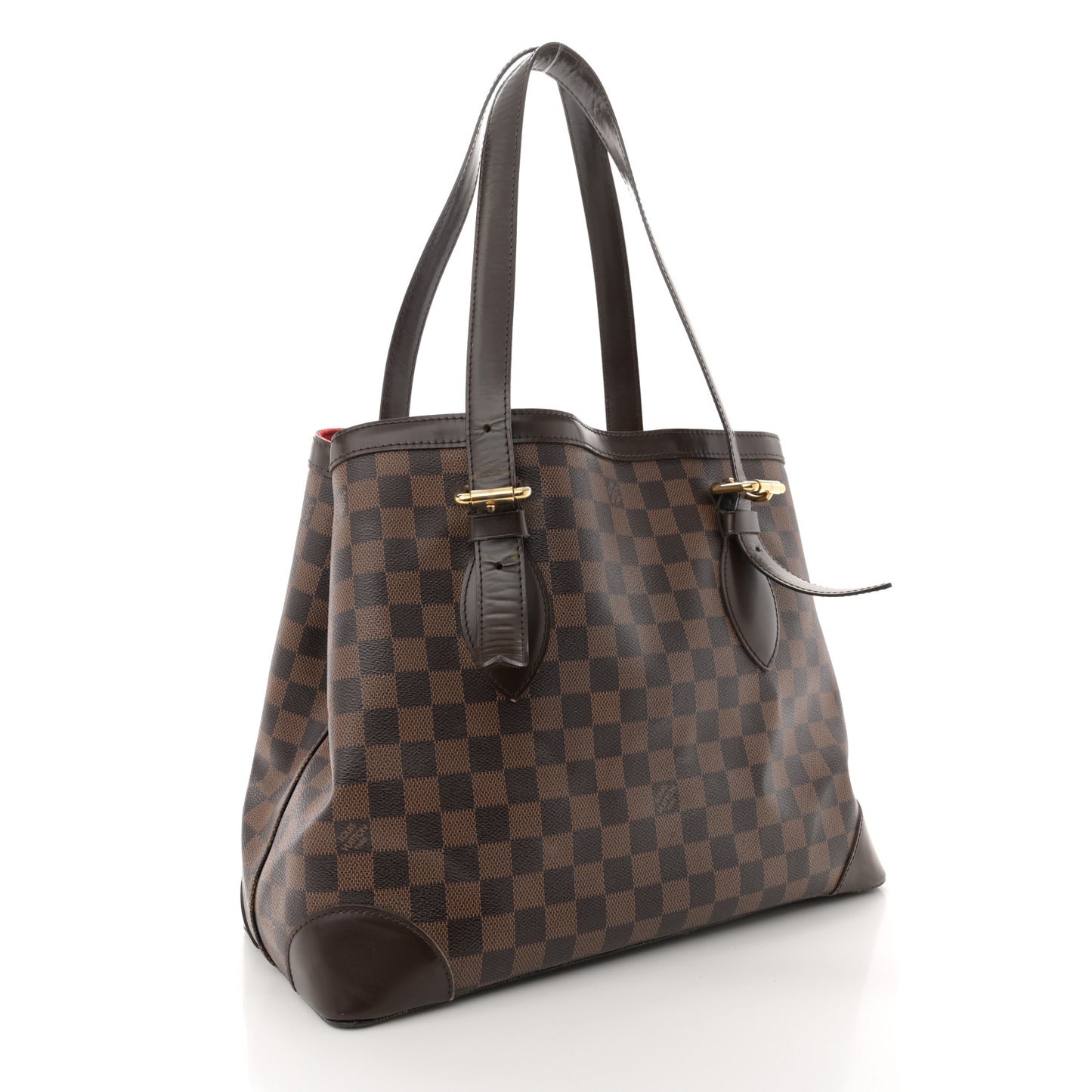 This is an authentic LOUIS VUITTON Damier Ebene Hampstead MM. This stylish shoulder bag is crafted of Louis Vuitton signature checked damier canvas in brown. This bag features polished gold hardware, brown leather trim, and tall adjustable handles. The top opens to a red microfiber interior with zipper and patch pockets.Follow this item for alerts. Louis Vuitton is a registered trademark of Louis Vuitton. FASHIONPHILE is not affiliated with Louis Vuitton.