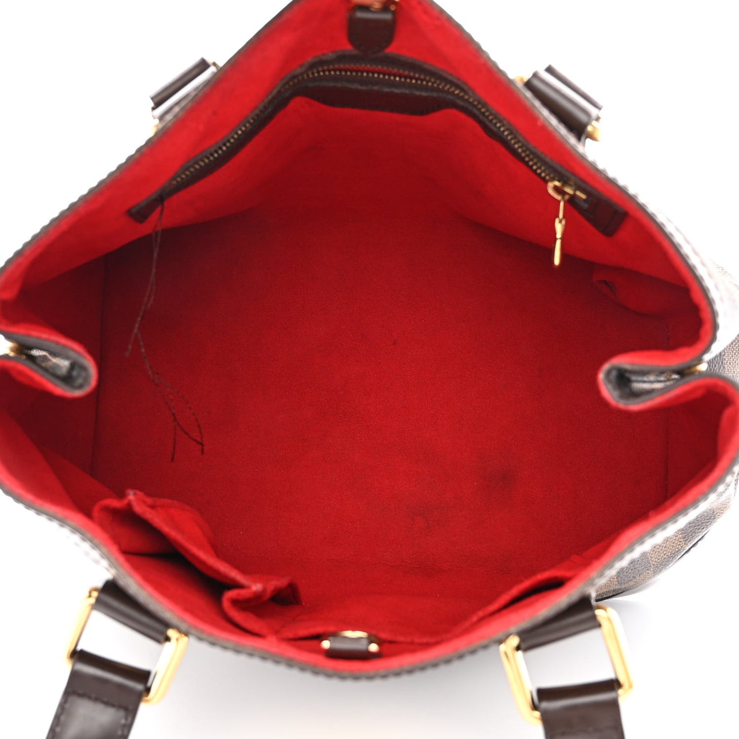 This is an authentic LOUIS VUITTON Damier Ebene Hampstead PM. This stylish tote is crafted of Louis Vuitton signature checkerboard coated canvas with chocolate brown leather handles, reinforced base corners, and trim, with brass hardware. The top of the bag is open to a rouge red microfiber interior with zipper and patch pockets.Follow this item for alerts. Louis Vuitton is a registered trademark of Louis Vuitton. FASHIONPHILE is not affiliated with Louis Vuitton.