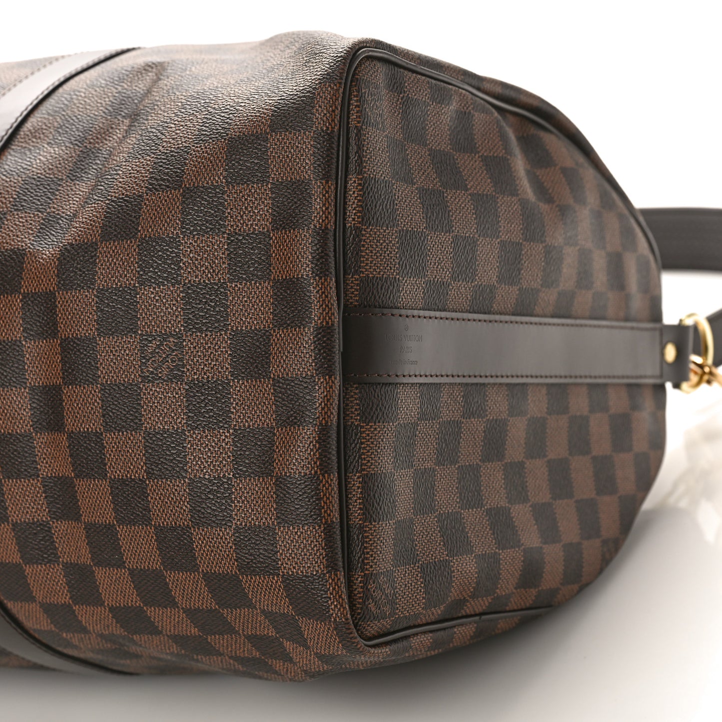 This is an authentic LOUIS VUITTON Damier Ebene Keepall Bandouliere 45. This classic travel duffel bag is crafted of damier checkered coated canvas with dark brown leather accents. It features rolled leather top handles, a detachable leather shoulder strap, and brown leather trimming along the sides of the bag. The top polished gold zippers open to a spacious brown fabric interior with a zipper pocket.Follow this item for alerts. Louis Vuitton is a registered trademark of Louis Vuitton. FASHIONPHILE is not affiliated with Louis Vuitton.