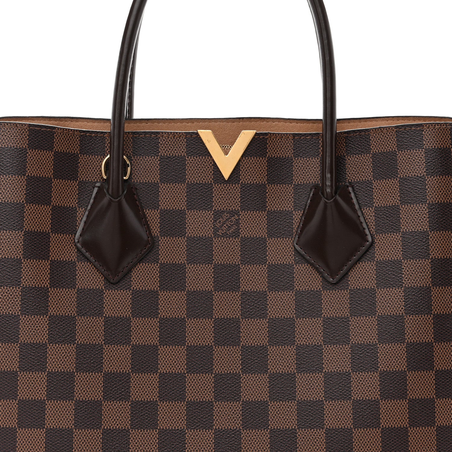 This is an authentic LOUIS VUITTON Damier Ebene Kensington. This chic tote is crafted of signature damier toile checkered canvas. This shoulder bag features rolled mocha leather handles and a polished brass cut out V at the top center. The top opens to a partitioned microfiber beige interior with a central zipper compartment.