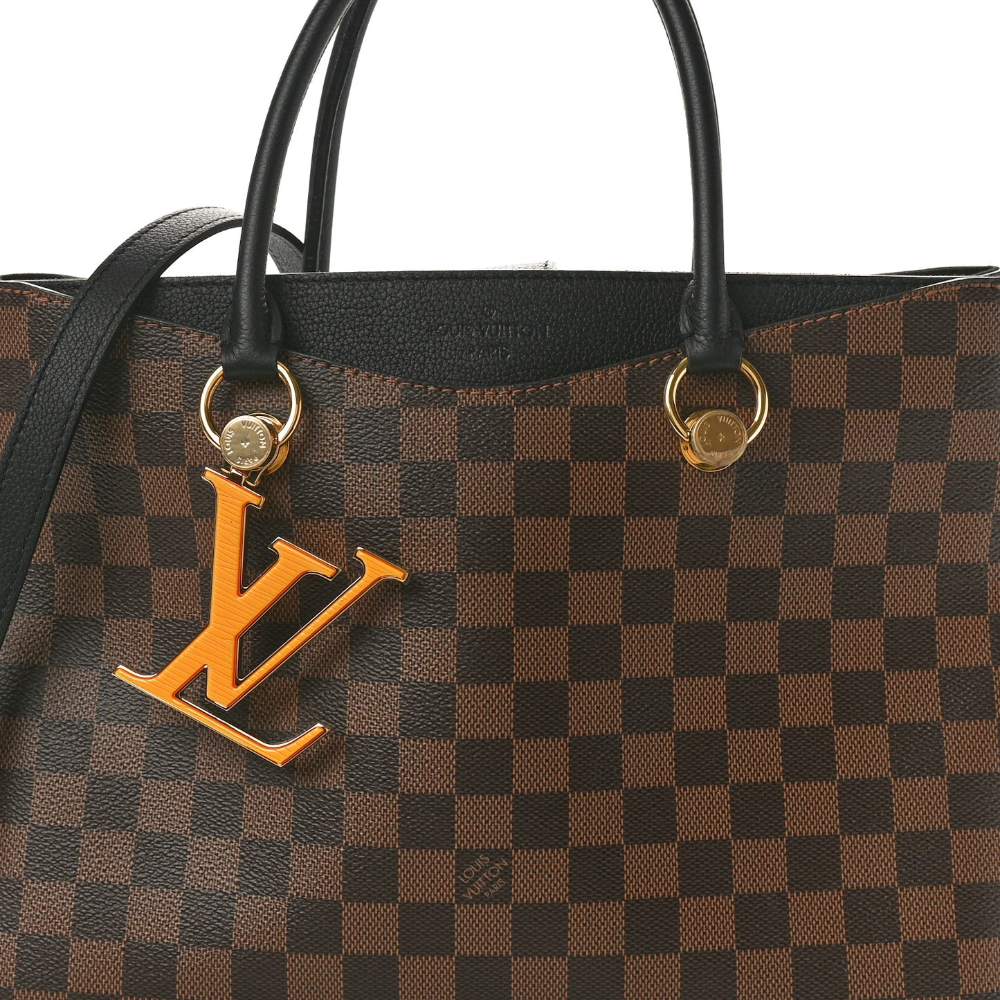 This is an authentic LOUIS VUITTON Damier Ebene LV Riverside in Black. This chic tote is crafted of signature checkerboard coated toile canvas in dark brown with black leather accents. The bag features rolled top handles, an optional leather shoulder strap, a prominent orange epi leather LV charm set in gold-toned hardware on the front and a small black leather crossover strap. This opens to a black microfiber interior with a central zipper compartment.Follow this item for alerts. Louis Vuitton is a registered trademark of Louis Vuitton. FASHIONPHILE is not affiliated with Louis Vuitton.