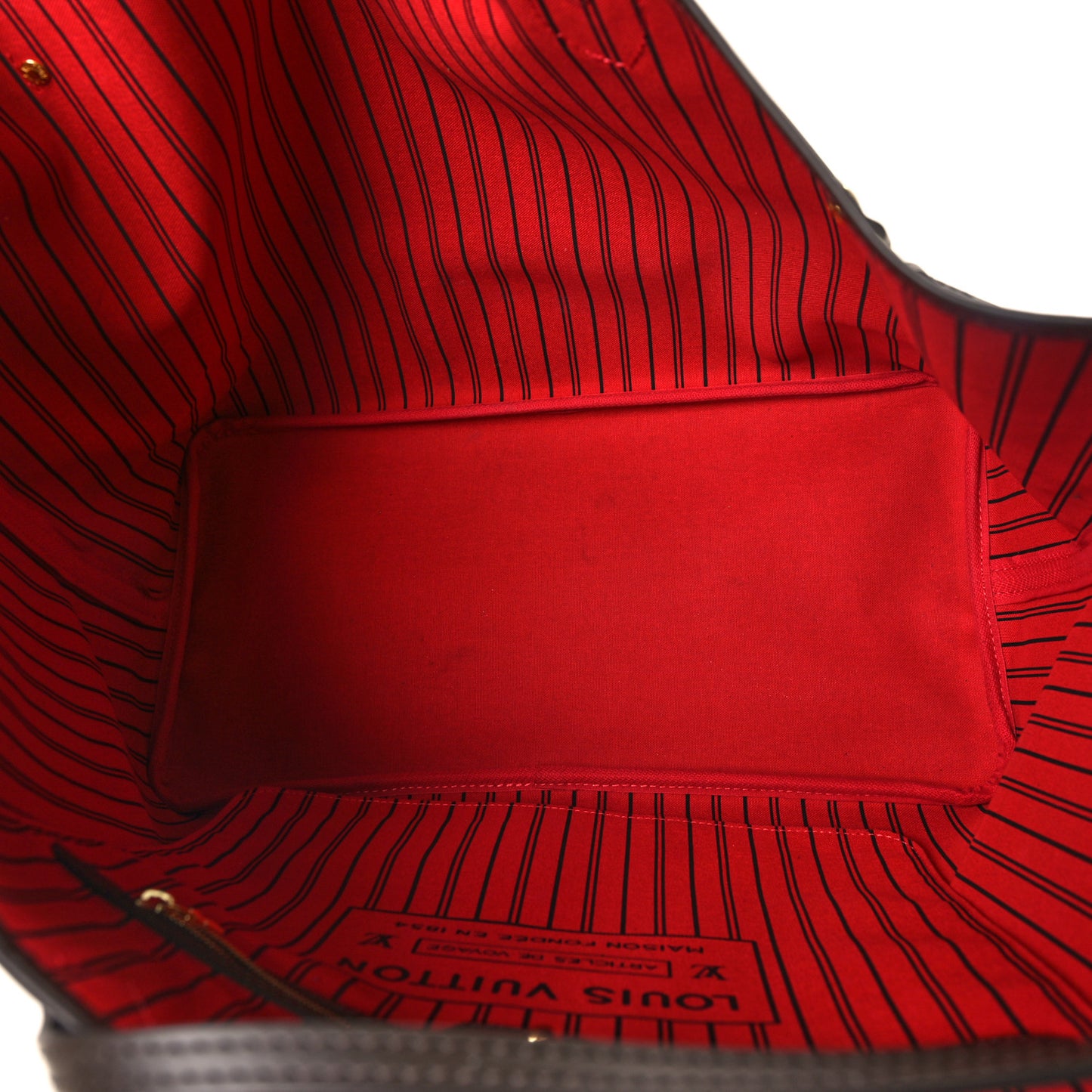 This is an authentic LOUIS VUITTON Damier Ebene Neo Neverfull GM. This chic tote bag is crafted of classic Louis Vuitton Damier checkerboard canvas with dark brown cowhide leather shoulder straps and cinch straps. The top is open to an interior of rouge red striped fabric with a hanging zipper pocket.