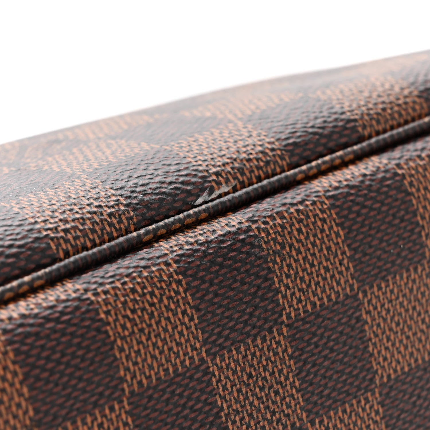 This is an authentic LOUIS VUITTON Damier Ebene Neo Neverfull size MM. This chic handbag is crafted of classic Louis Vuitton Damier canvas. The tote features dark brown cowhide leather shoulder straps, trim, and side cinch cords with polished gold hardware. The top is open to an interior of rouge red striped fabric with a hanging zipper pocket and a matching pochette.Follow this item for alerts. Louis Vuitton is a registered trademark of Louis Vuitton. FASHIONPHILE is not affiliated with Louis Vuitton.